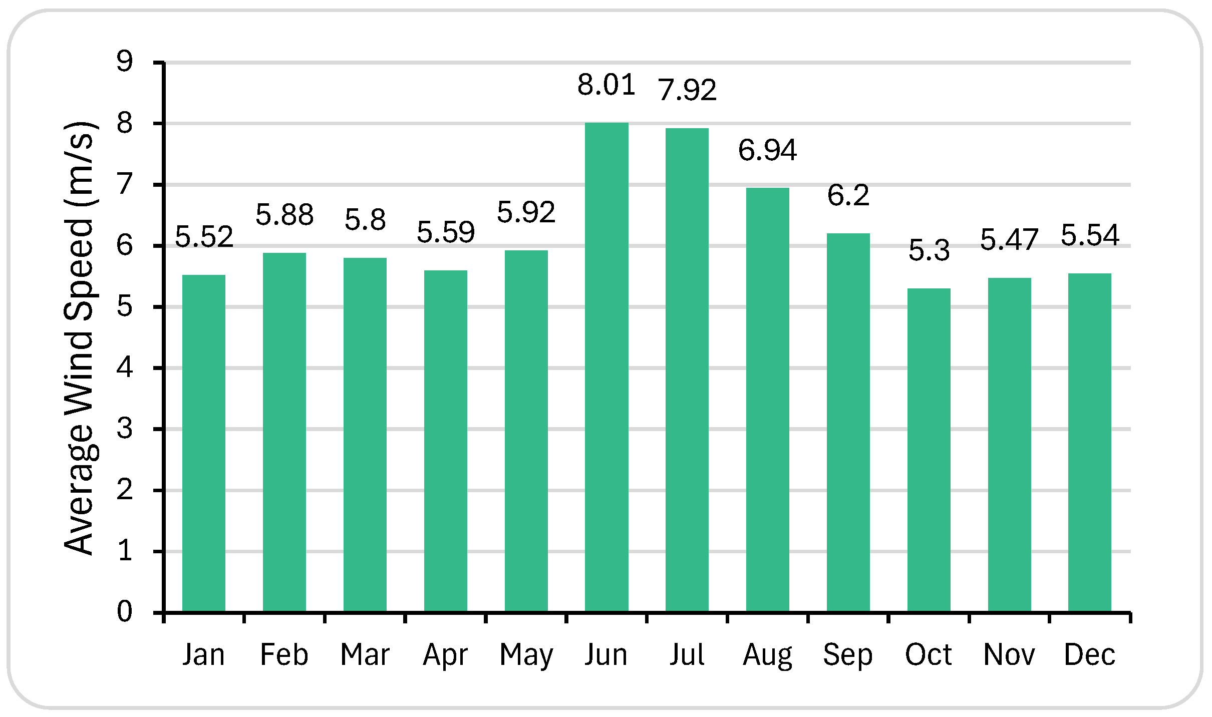 While both solar and wind resources in Kuwait exhibit seasonal peaks during the summer, their true complementarity is more pronounced on a diurnal (24 h) timescale. Solar PV generation occurs exclusively during daytime hours, typically between 06:00 and 18:00 h, whereas wind speeds in Kuwait often intensify during the late afternoon, evening, and early-morning hours, sustaining generation when solar output drops. This day–night alternation enables the hybrid system to provide a smoother total power profile and reduce reliance on grid energy. Although the present analysis focused on monthly averages, HOMER’s hourly data confirm that wind production extends overnight, complementing the solar resource within each daily cycle. Future work will include explicit hourly generation plots for hybrid systems to visualize this diurnal complementarity and to quantify its contribution to system reliability.