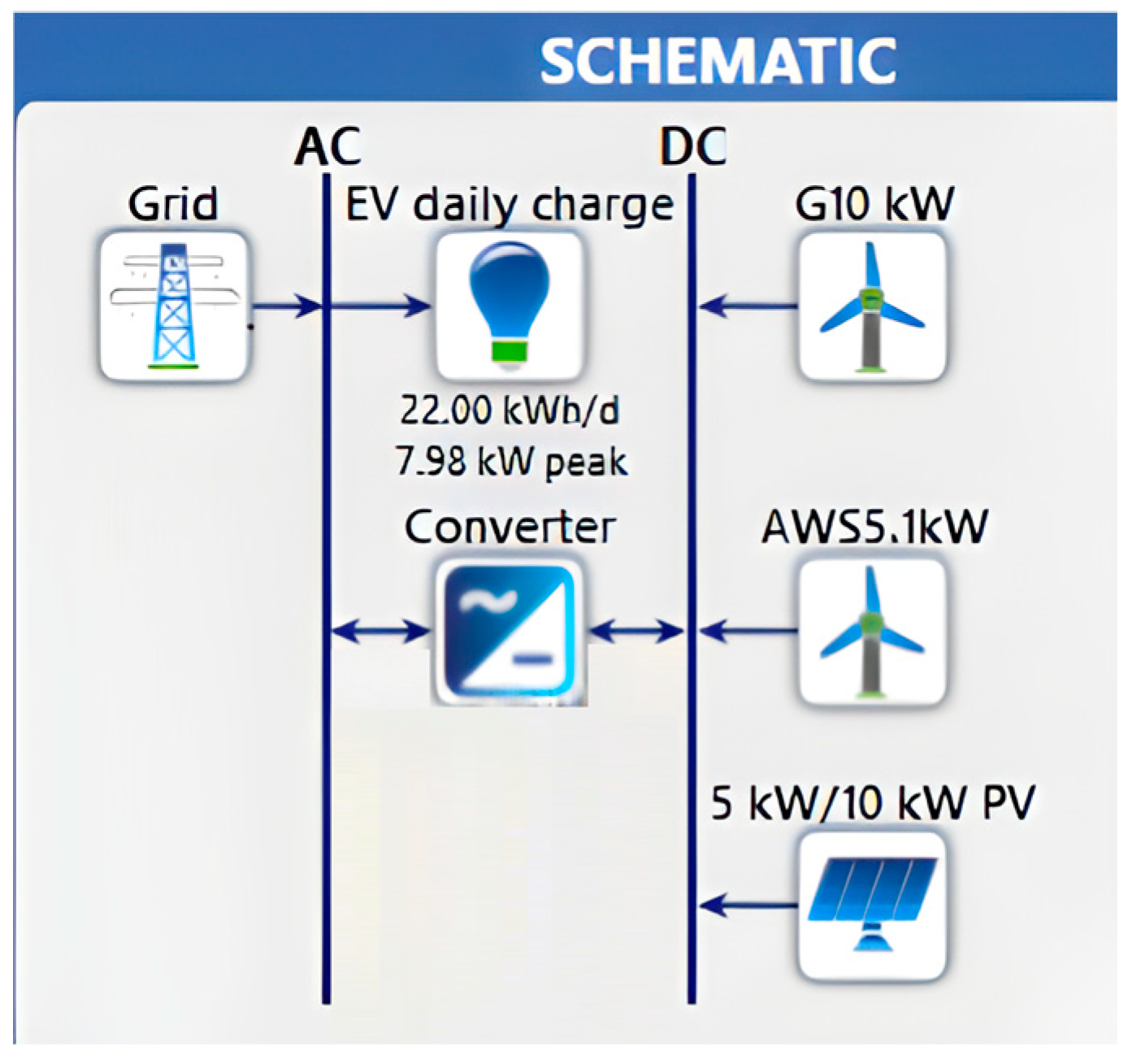 Each configuration included a 5 kW inverter to ensure bidirectional power conversion between DC (renewable) and AC (grid/charging) systems. Default component lifespans, efficiencies, and maintenance schedules were adopted from the HOMER component database.