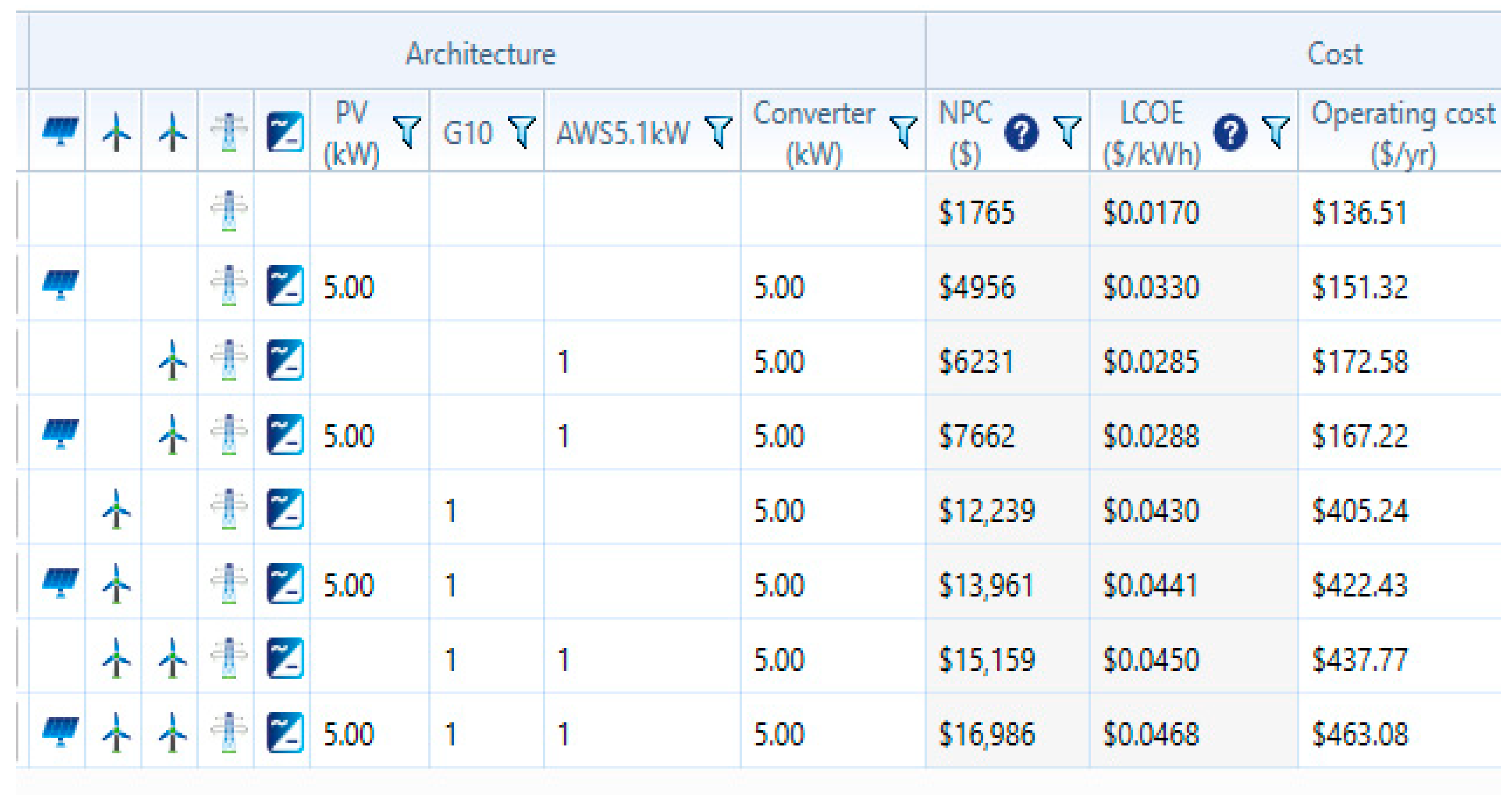 24]. A 5 kW PV array and 5.1 kW wind turbine were chosen as typical residential-to-commercial scale capacities that balance technical feasibility, installation space, and investment cost. These capacities correspond to common single-phase inverter ratings (≈5 kW) used in grid-connected systems and ensure equitable comparison among the four configurations by maintaining identical total power ratings. The BEIJIAYI 600 W PV modules and AWS 5.1 kW turbine were selected because both models are commercially available, widely tested in similar arid climates, and included in the HOMER component database with validated performance parameters.