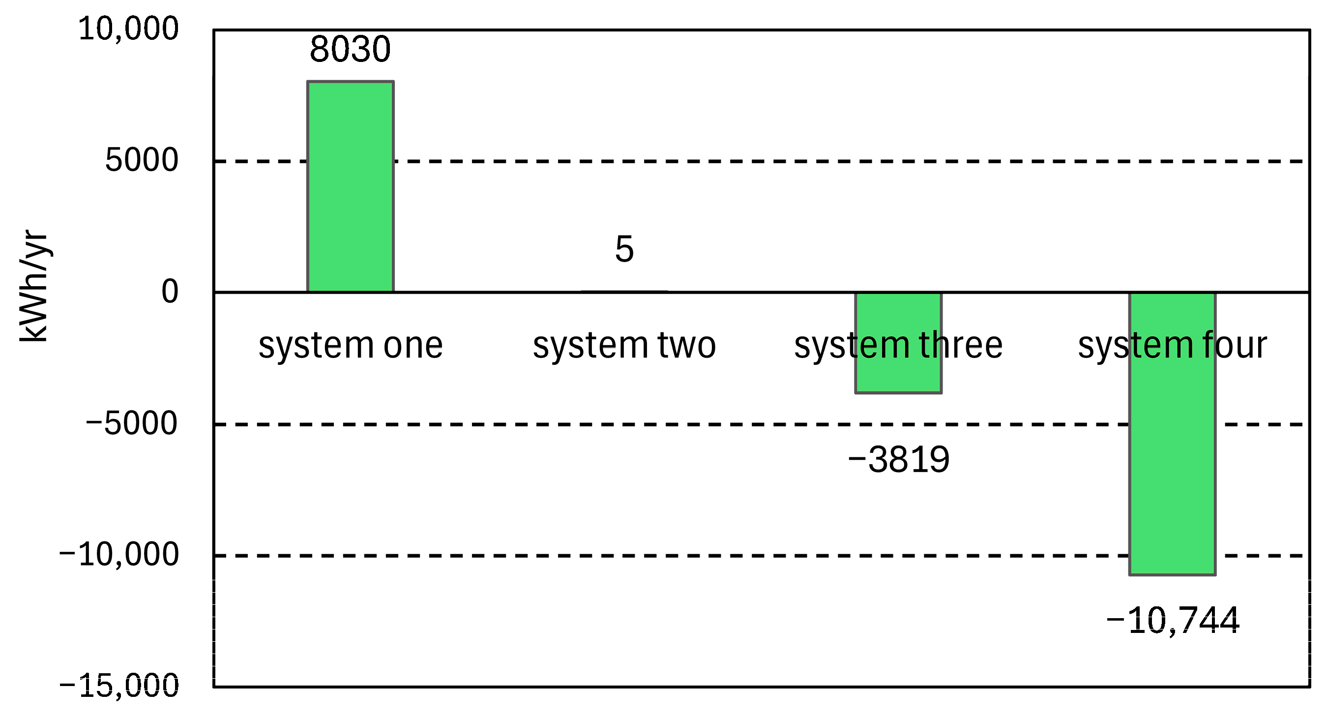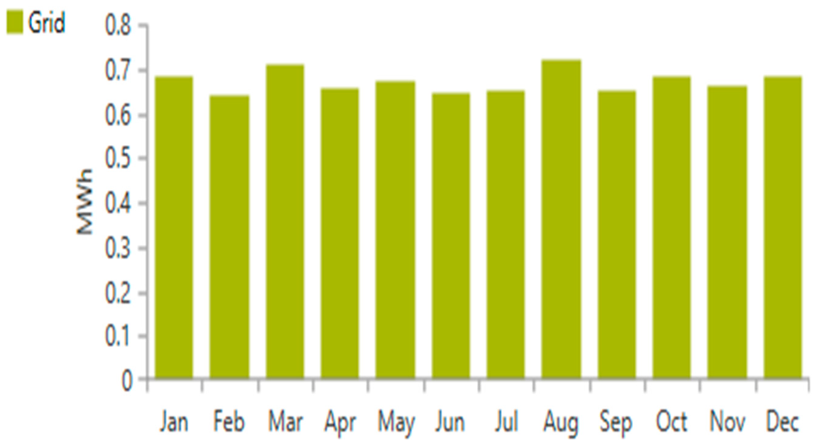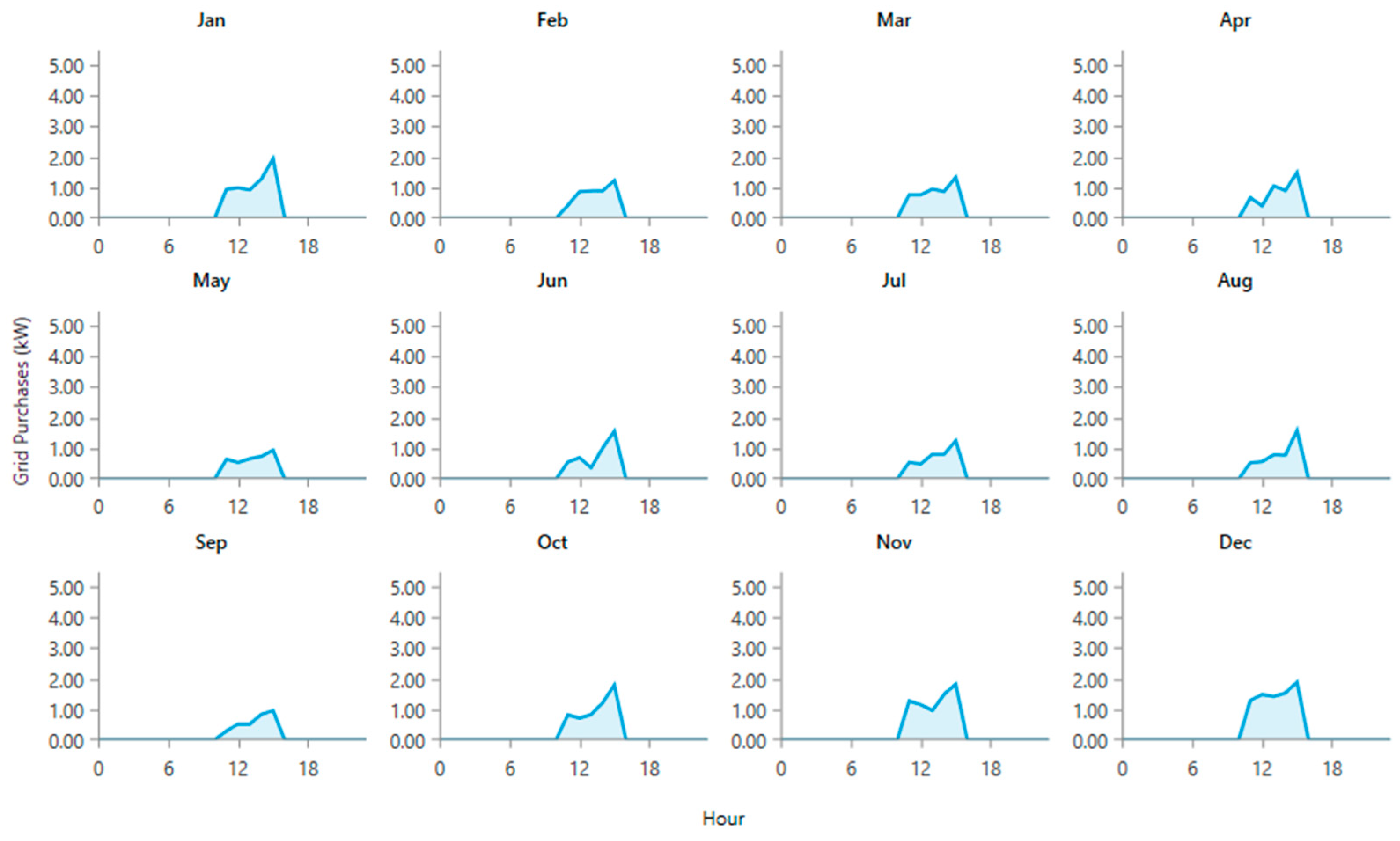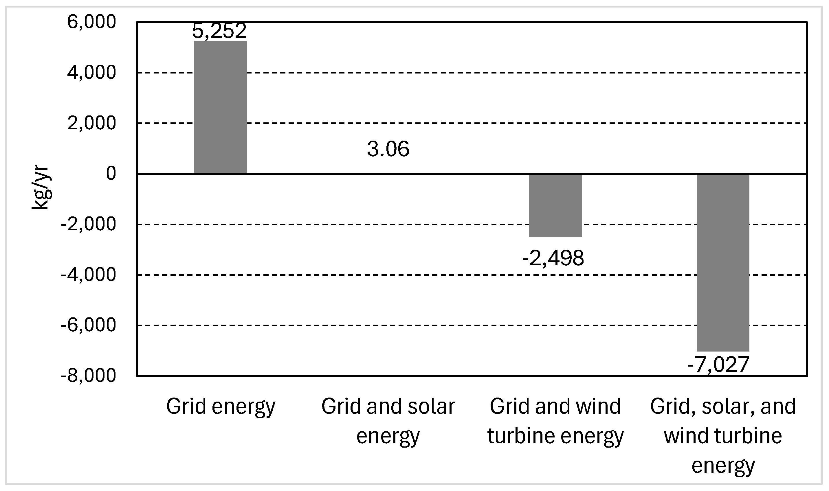 Conversely, the grid-only configuration, while least expensive initially, exhibited the greatest environmental impact and full reliance on fossil fuel electricity. The solar-assisted system reduced grid usage by more than 50%, whereas the wind-assisted system provided seasonal support and moderate savings.