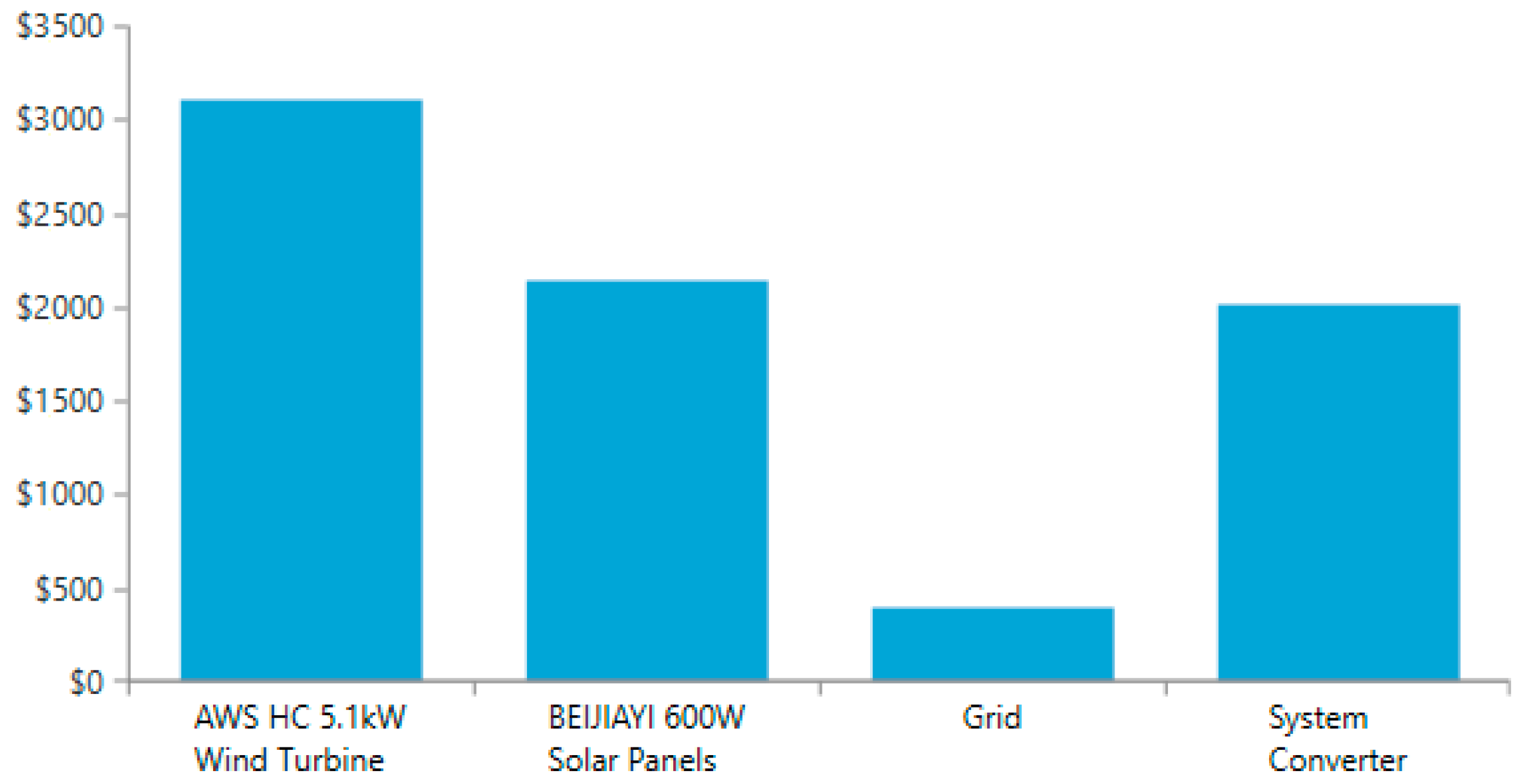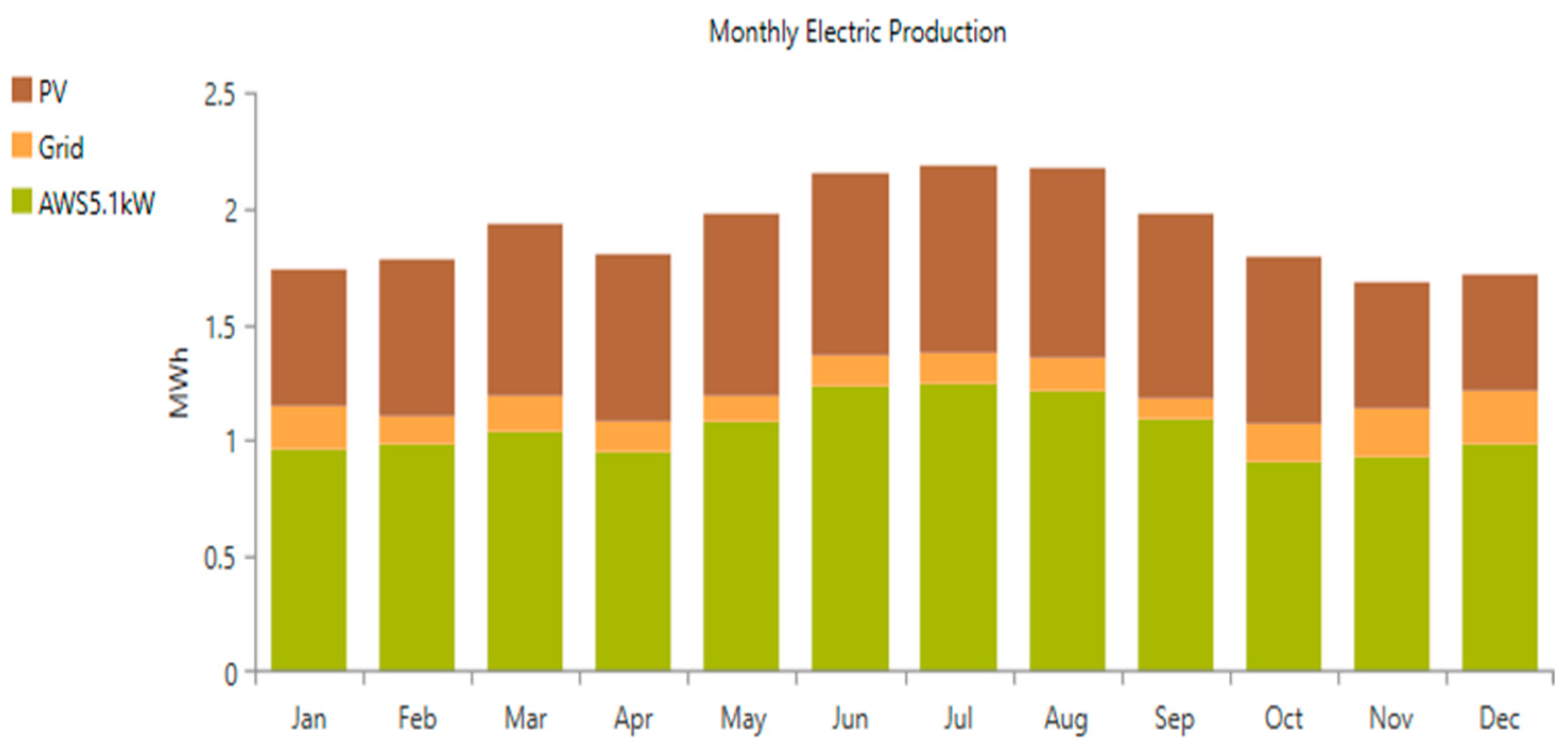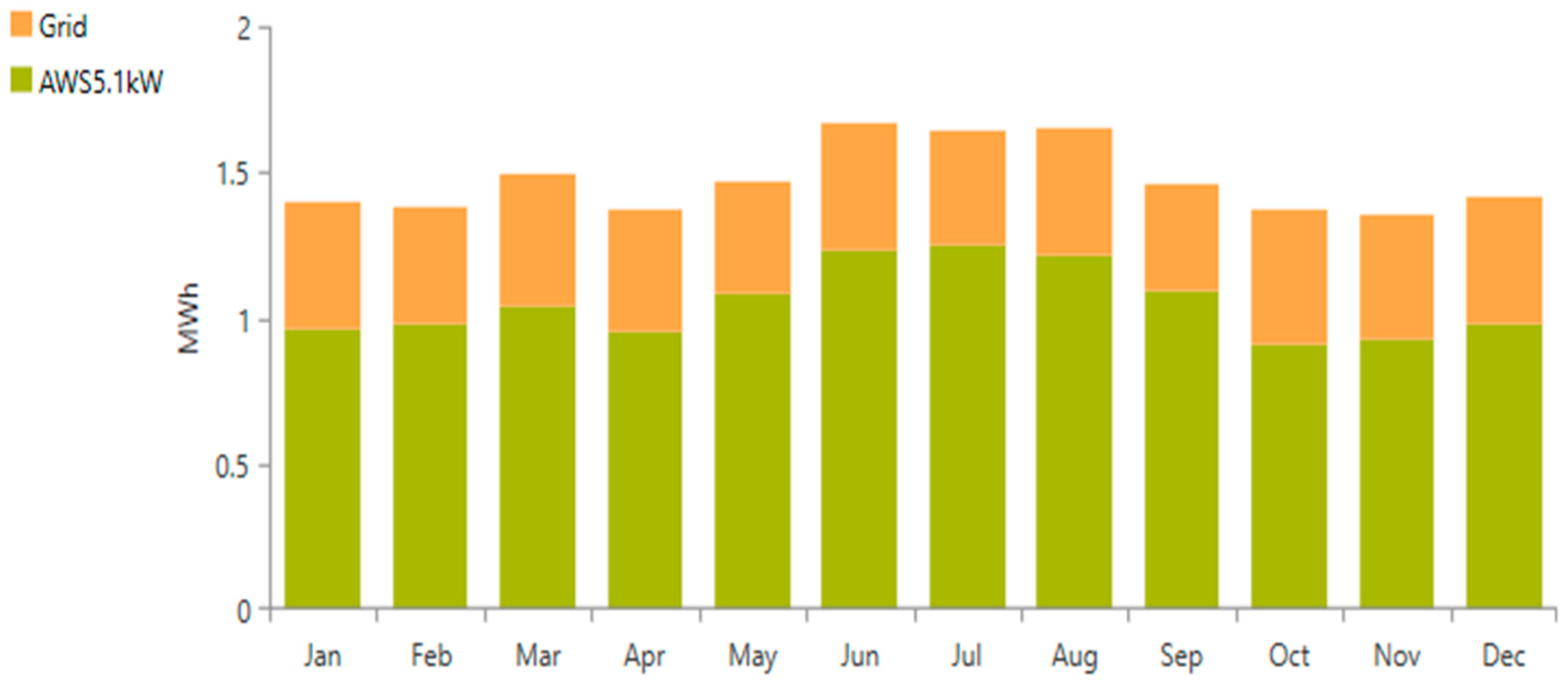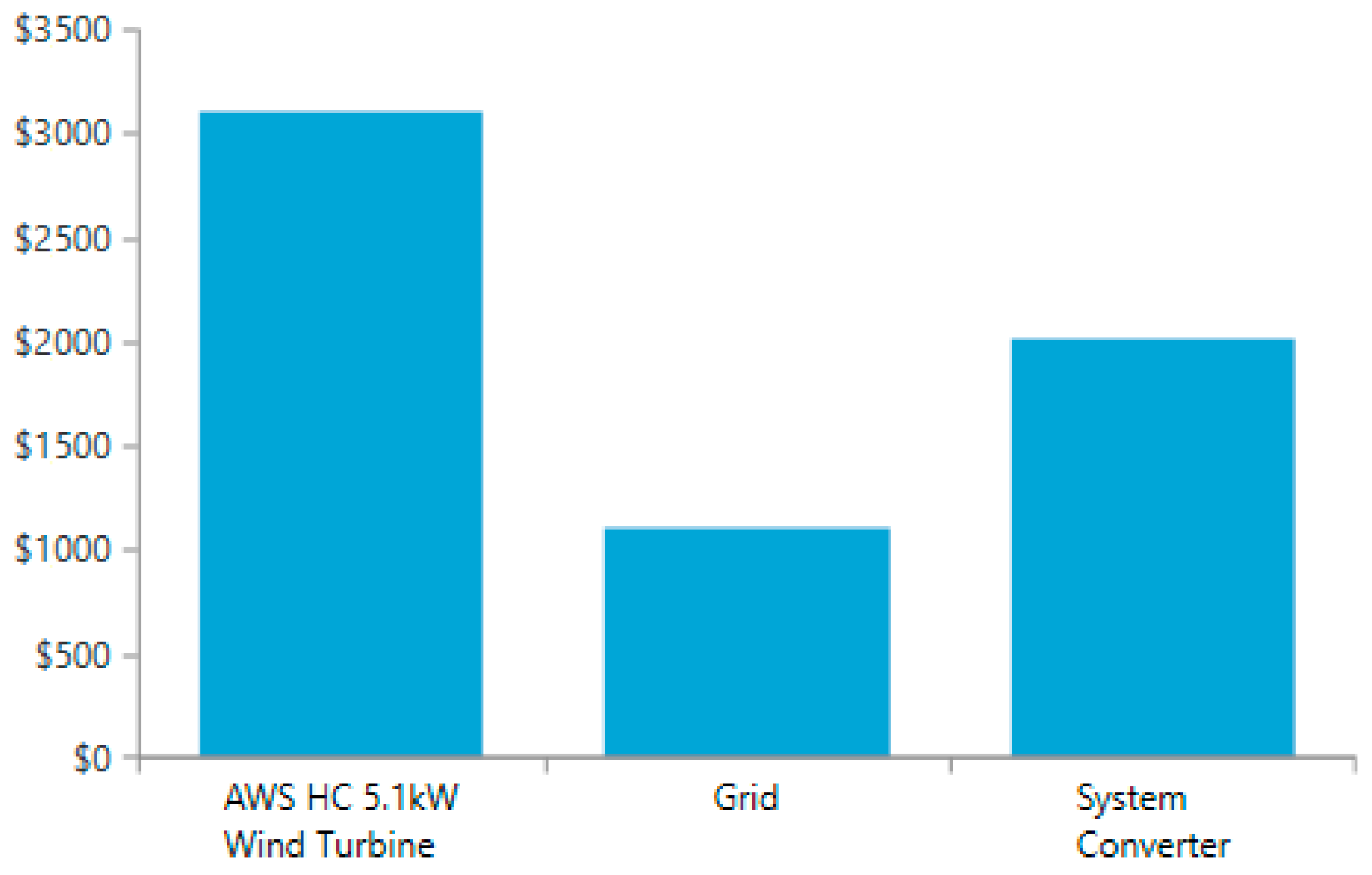 System 3—Grid–Wind: Grid electricity supported by a 5.1 kW wind turbine (AWS model).