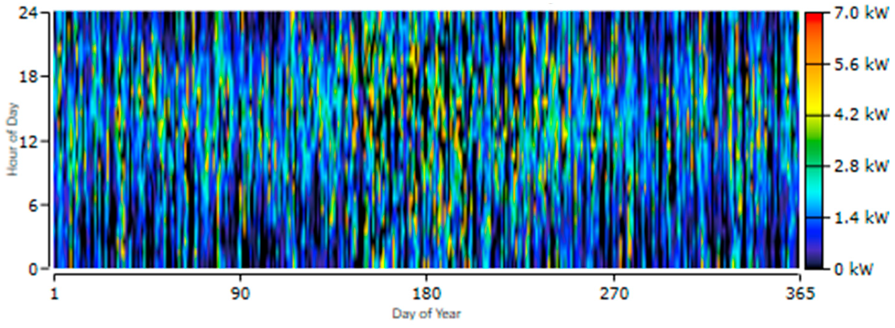 These input parameters were used in HOMER to compute energy production, COE, and NPC. Because HOMER’s optimization results are highly sensitive to these variables, all values were validated against typical ranges reported in the recent literature for small-scale hybrid systems deployed in arid climates. The capital cost was set at USD 420/kW, with annual Operation and Maintenance (O&M) costs of USD 10/kW and a replacement cost equal to 80% of the initial investment. The AWS 5.1 kW horizontal axis wind turbine was assumed to operate between 3 m/s (cut-in) and 25 m/s (cut-out) with a rated speed of 12 m/s and a lifetime of 20 years. The turbine cost was set at USD 610/kW, with O&M costs of USD 25/kW/year and a replacement cost of 70% of the initial investment. The inverter efficiency was 95%, with a lifetime of 15 years and replacement cost of 60% of its initial capital value (USD 300/kW). These assumptions were drawn from HOMER’s internal database and verified against data from Alazemi et al. [