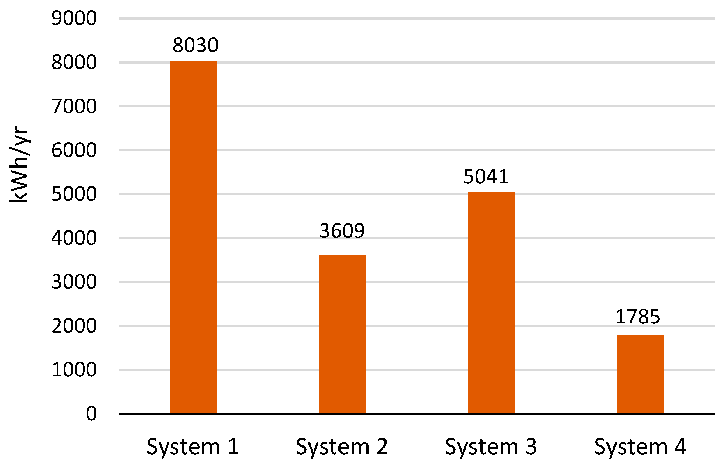 System 4—Grid–Solar–Wind: Hybrid configuration combining both 5 kW PV and 5.1 kW wind turbine units.