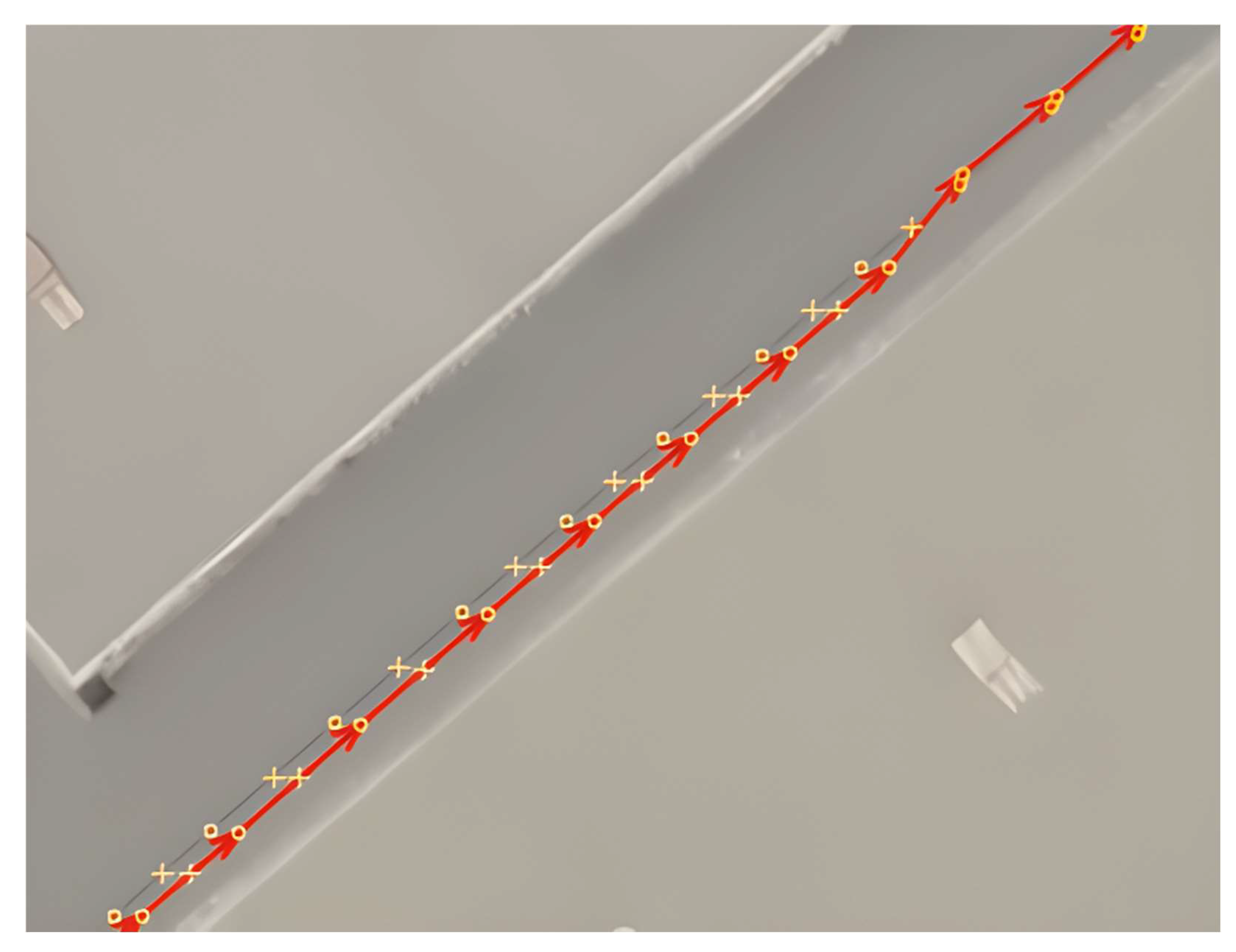 Subsequently, tests were conducted under real-world conditions. It was essential to apply the paint in a way that allowed modification of the virtual track during testing, including the simulation of intersections between two virtual tracks. Linoleum was selected as the base material for paint application due to its mechanical, chemical, and weight properties. Linoleum strips of 15 cm width and 400 cm length were prepared, and the paint was applied to them. The total testing length was 44 m for each paint type.