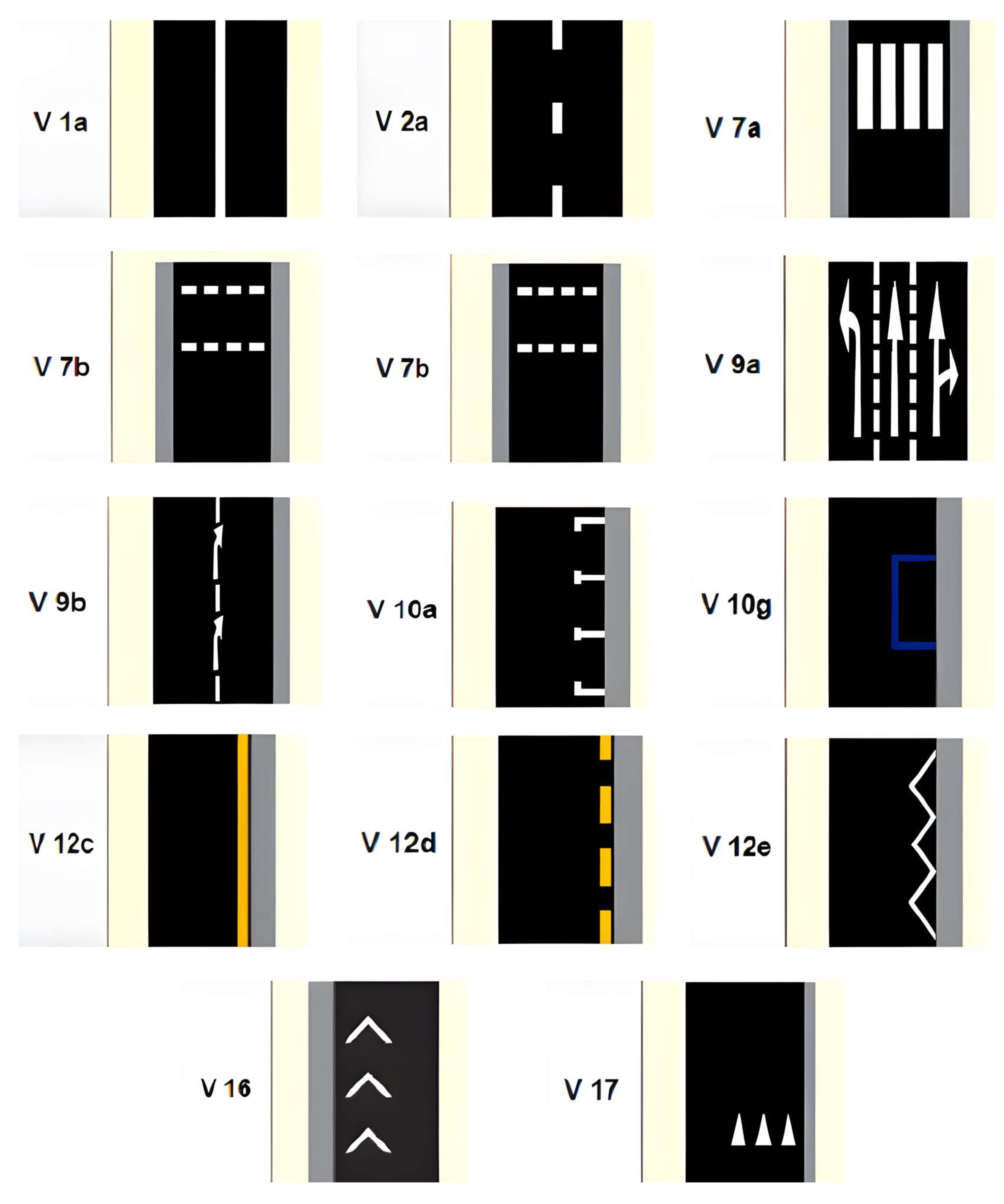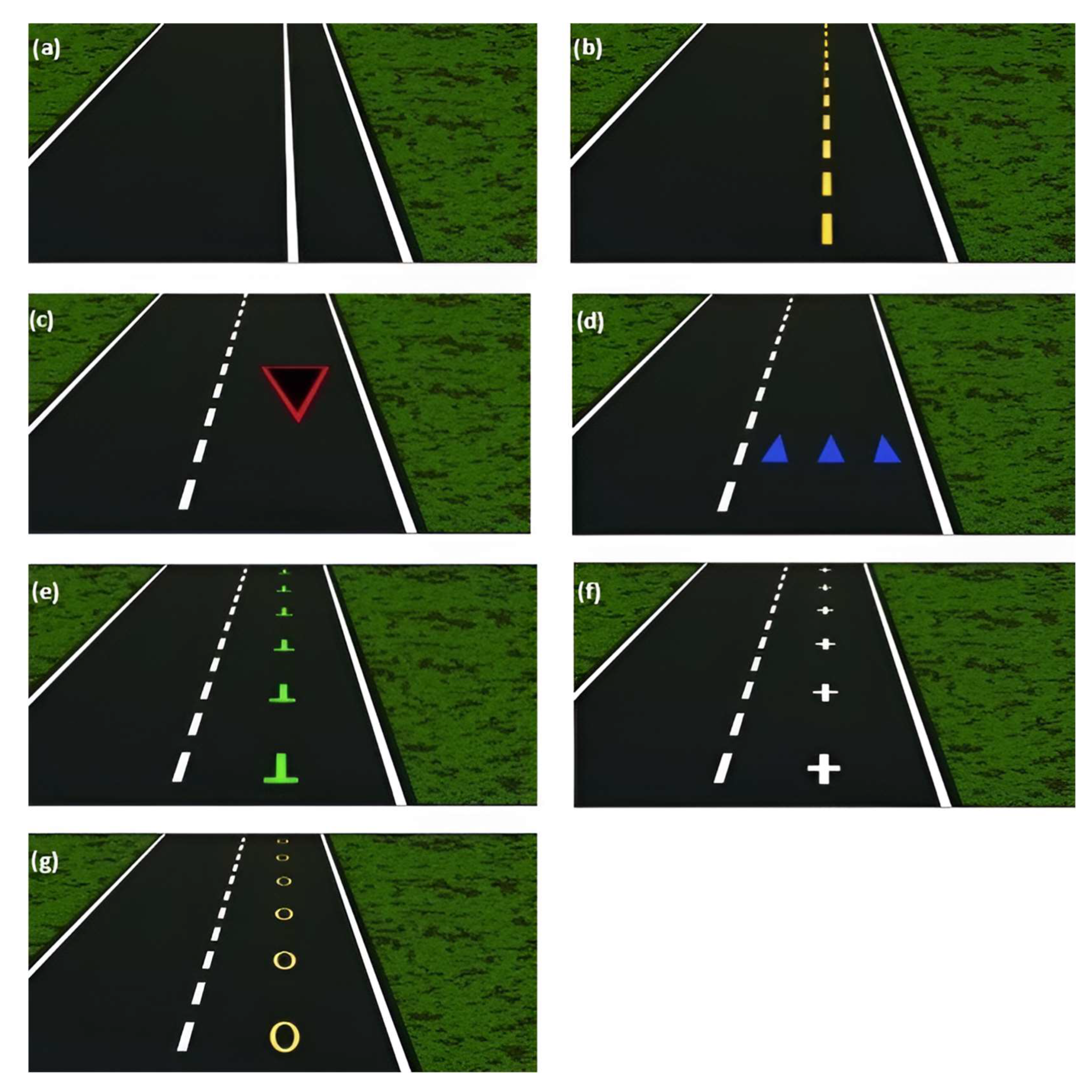 For this reason, a psychological experiment was conducted to examine drivers’ ability to distinguish between variants of virtual tracks and horizontal traffic signs. In this experiment, participants were exposed to images of the road. These individuals were tasked with determining whether the image contained only horizontal traffic signs or also objects that were not horizontal traffic signs. The full factorial design tested 7 shapes (solid line, dashed line, triangle, three triangles, inverted T, cross, ellipse) and 5 colors (white, yellow, red, blue, green), see