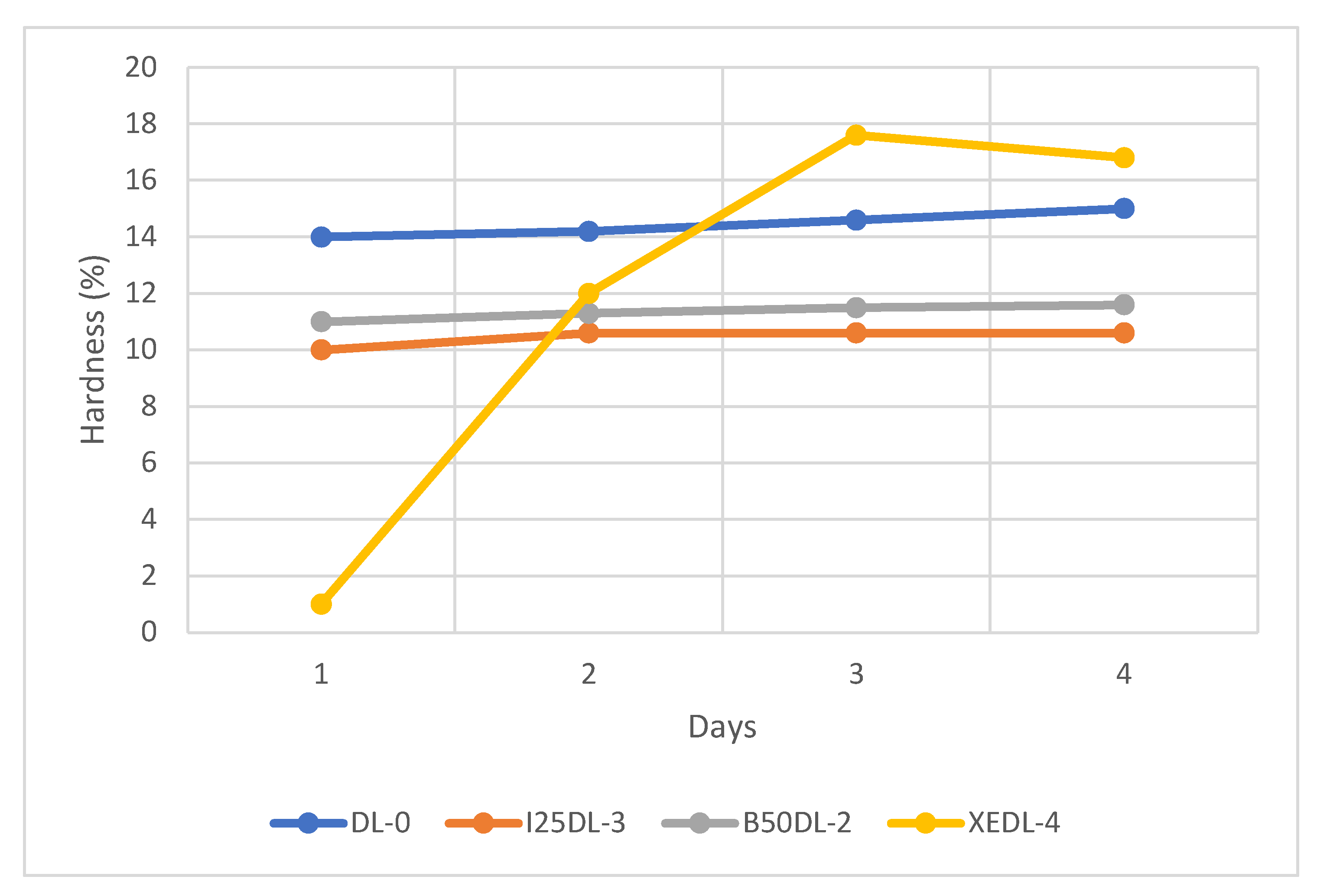 It is therefore evident that even after adjusting the pigment concentrations, the electrical responses remained relatively low or completely absent. Based on the measured electrical response, additional samples were eliminated, and the final accelerated mechanical-property tests were carried out only on samples B50DL, XEDL, and I25DL, which exhibited a measurable response. The prepared coating materials were subjected to hardness testing (