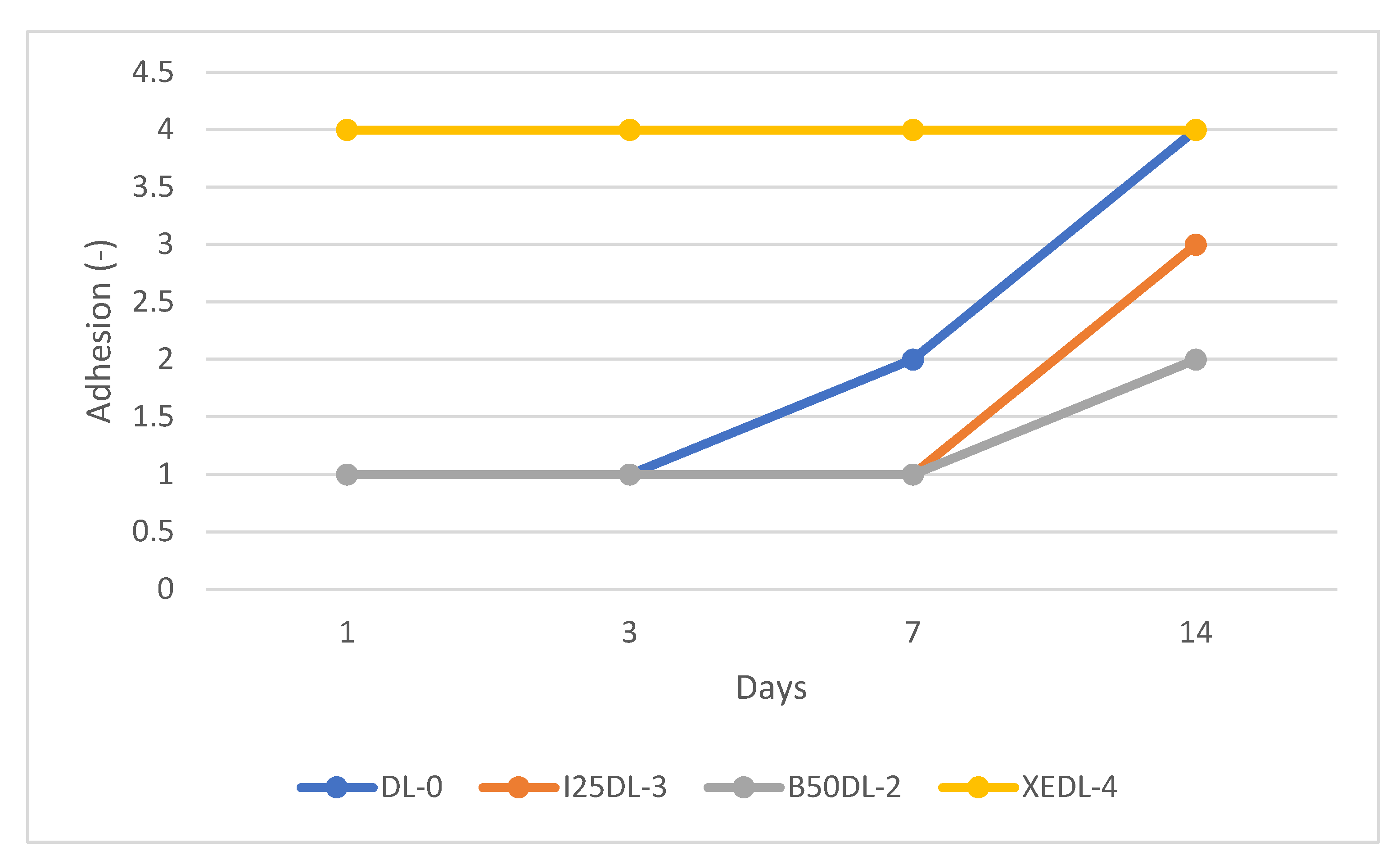 The adhesion of the coatings on a steel substrate deteriorated over time. The poorest adhesion was found in the coating containing carbon black (XEDL). The base coating (DL-0) showed poor adhesion to the steel substrate after 14 days, which may be attributed to the fact that these coating materials are not primarily intended for this type of substrate. Unfortunately, adhesion tests on actual pavement materials could not be performed using this method. The same tests were conducted for the LG sample set, and the results were similar, again due to an unsuitable choice of substrate.