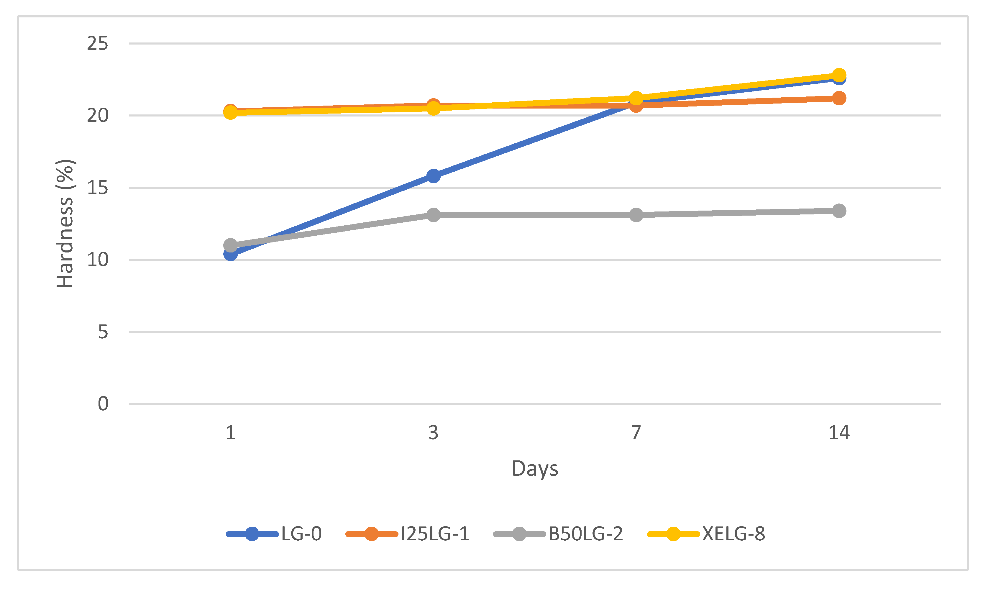 The base coating material (LG-0) gradually increased in hardness over time. The highest hardness values were again observed in the mixture containing carbon black (XELG). Overall, all mixtures using this binder exhibited higher hardness values than the previous formulations based on Degalan (see