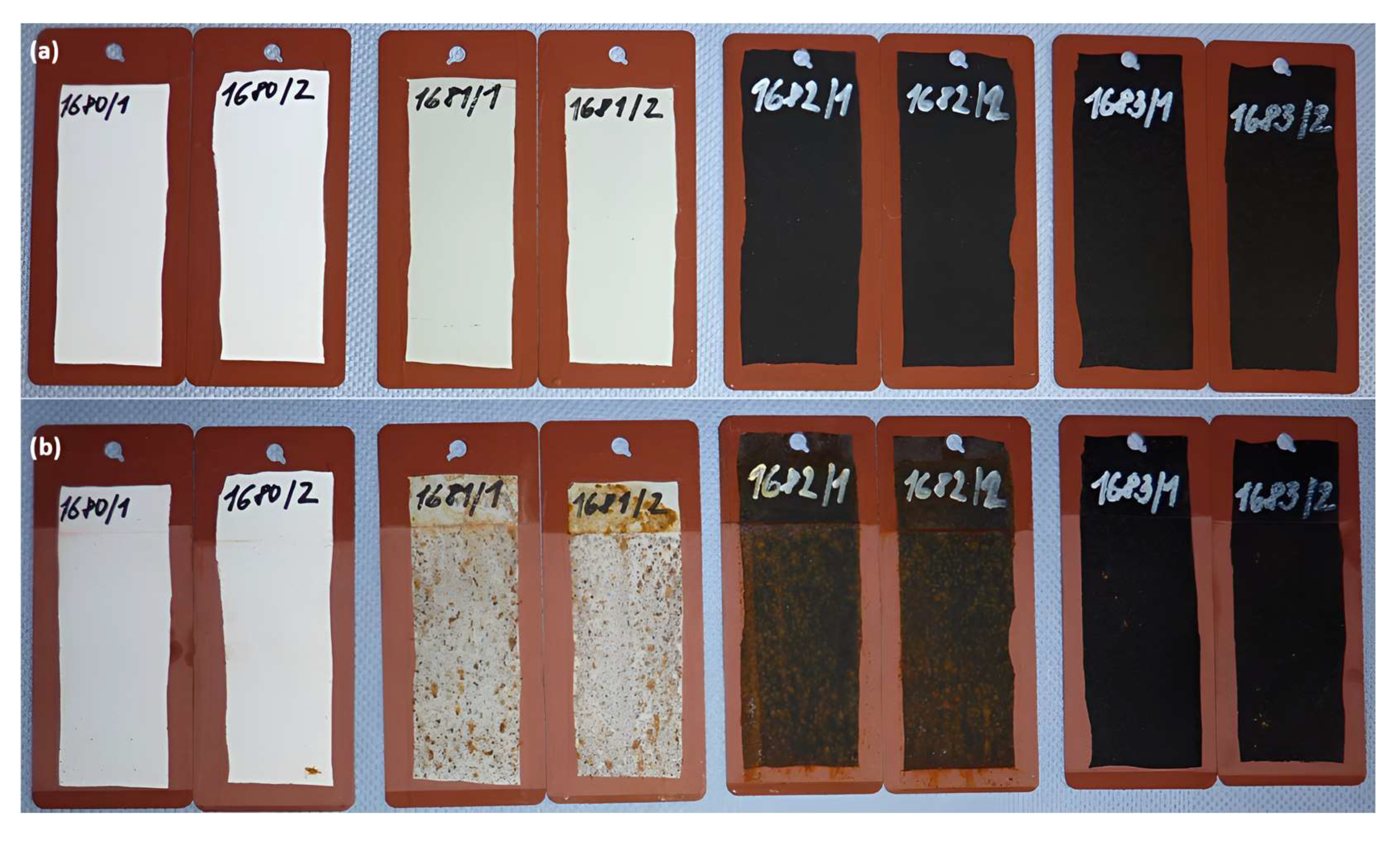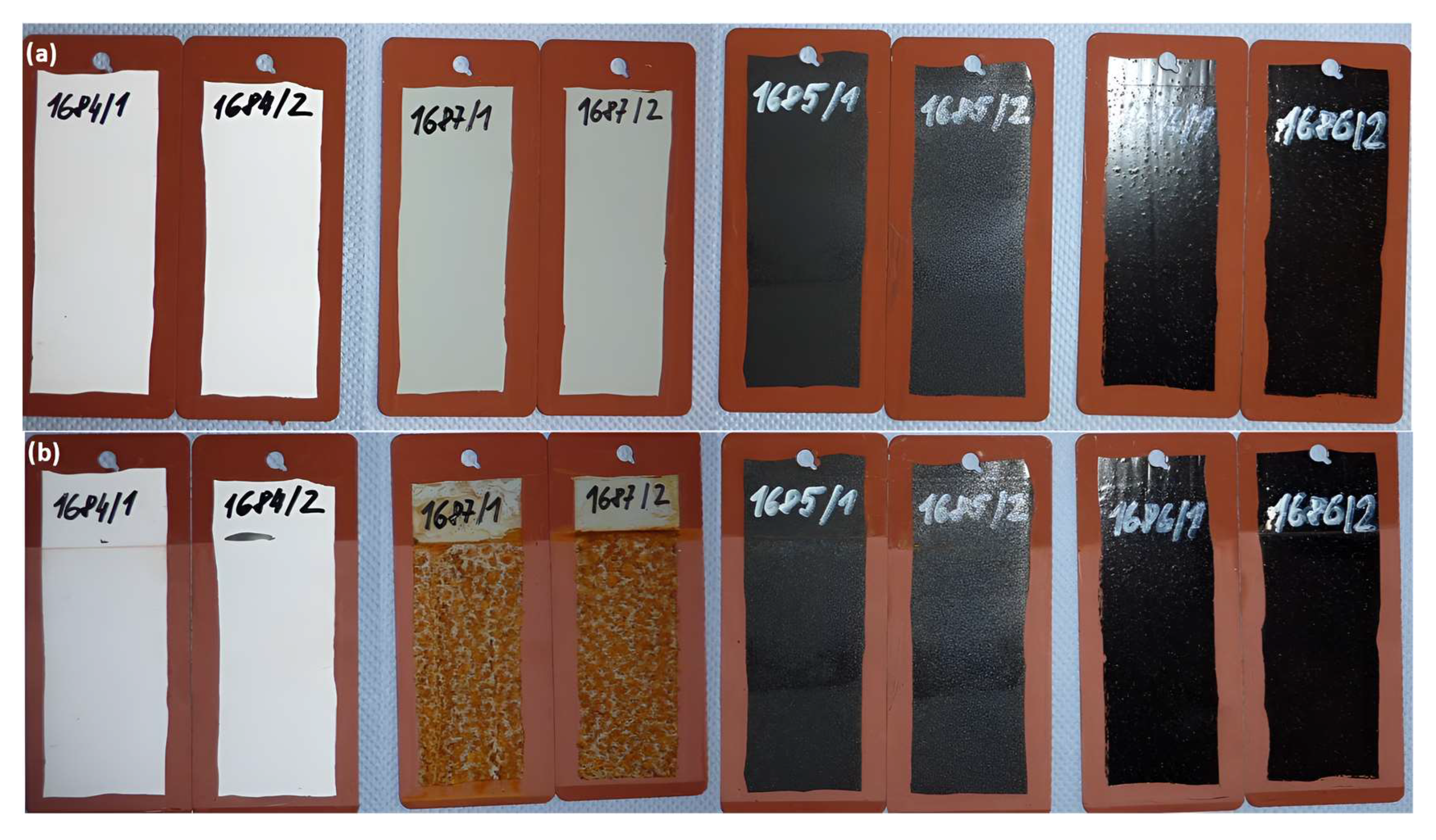 For subsequent mixtures, the pigments Iriotec 7320, Fepren HM472A, Fepren TP 200, Iriotec 7320, and Iriotec 7325 were excluded. The reasons for eliminating these samples included the appearance of the resulting CM, its consistency, and the fact that at the given concentrations, the mixtures became unsuitable for proper blending. During the development process, dispersing agents were also modified to improve the pigment dispersion within the CM. The original set of 10 + 1 samples was gradually reduced to six. Electrical resistance measurements were carried out on these selected samples as well; see