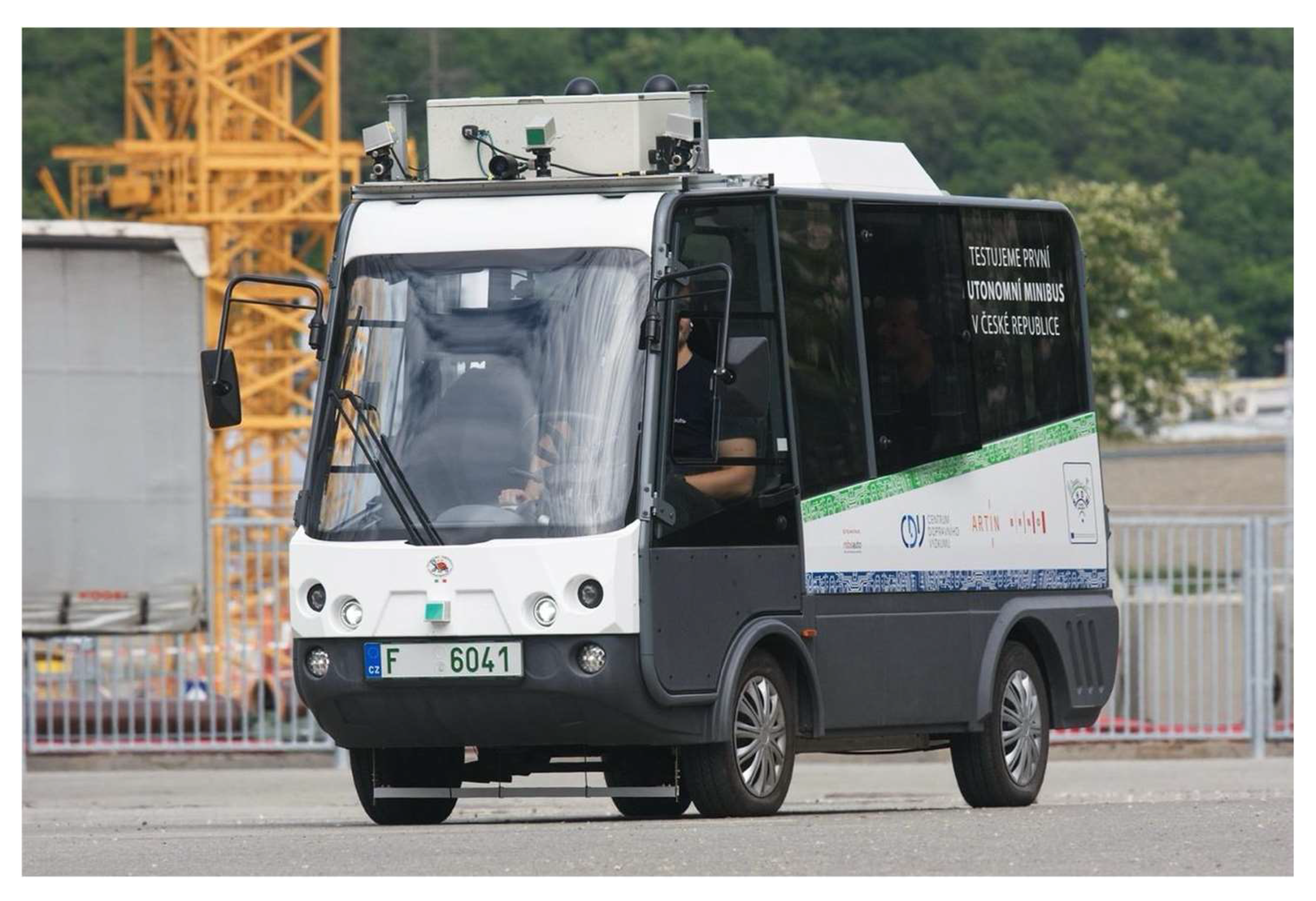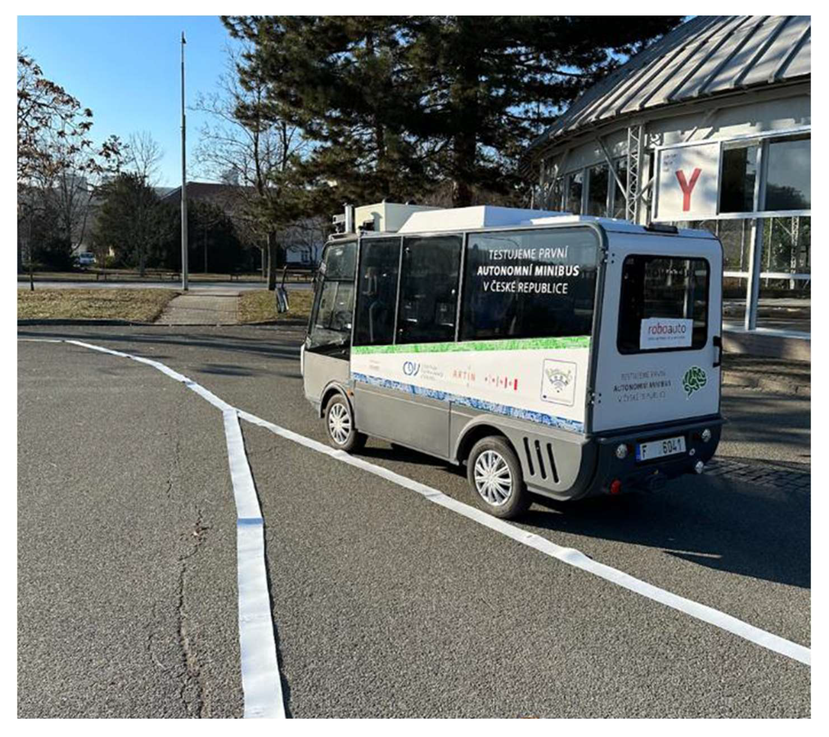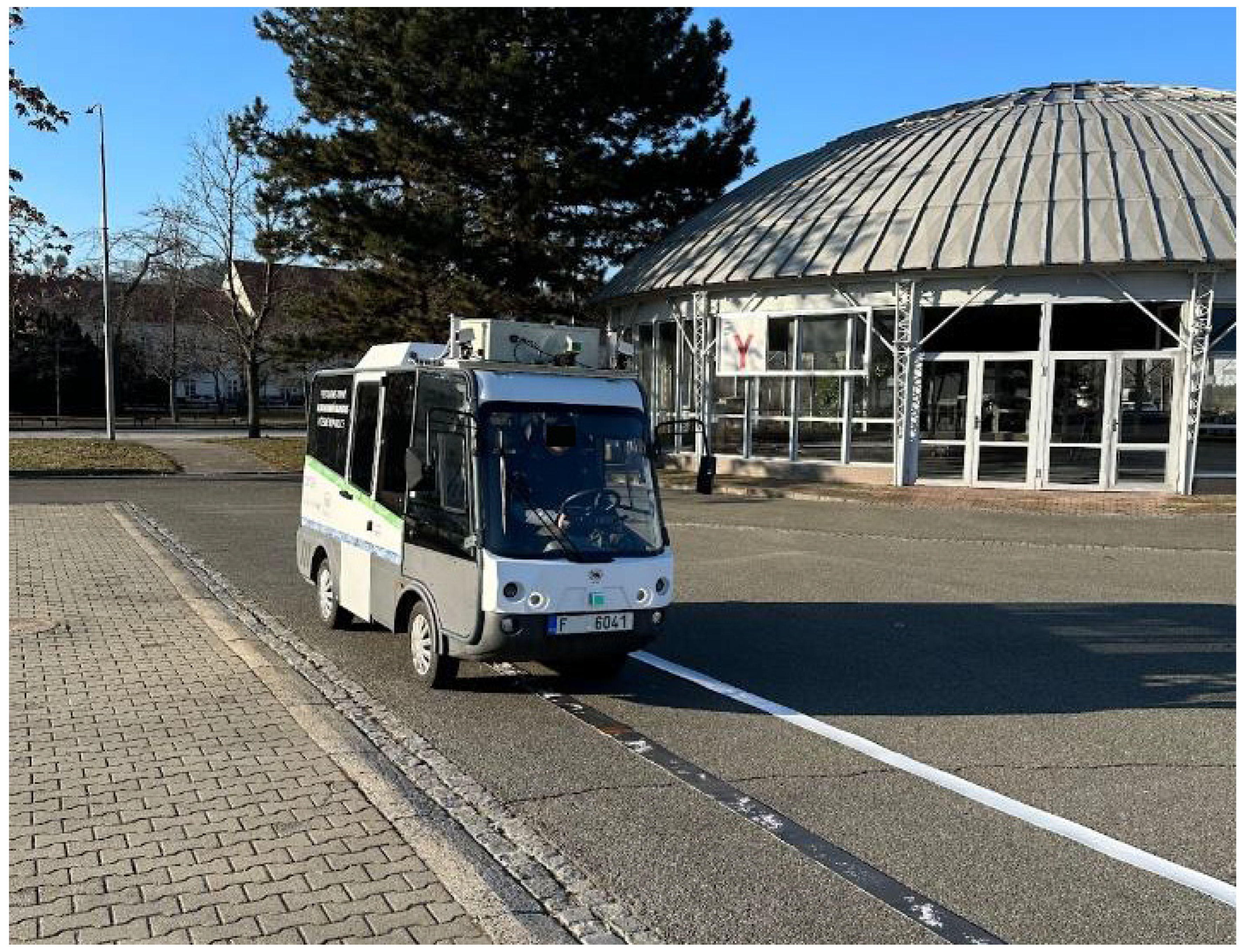 Figure 9) was used—a compact, fully electric minibus that serves as a technical platform for autonomous-driving research. The vehicle is based on the Geco Shuttle model and accommodates up to seven passengers. Its N1 homologation ensures compliance with European safety and operational standards for both passenger and cargo transport.