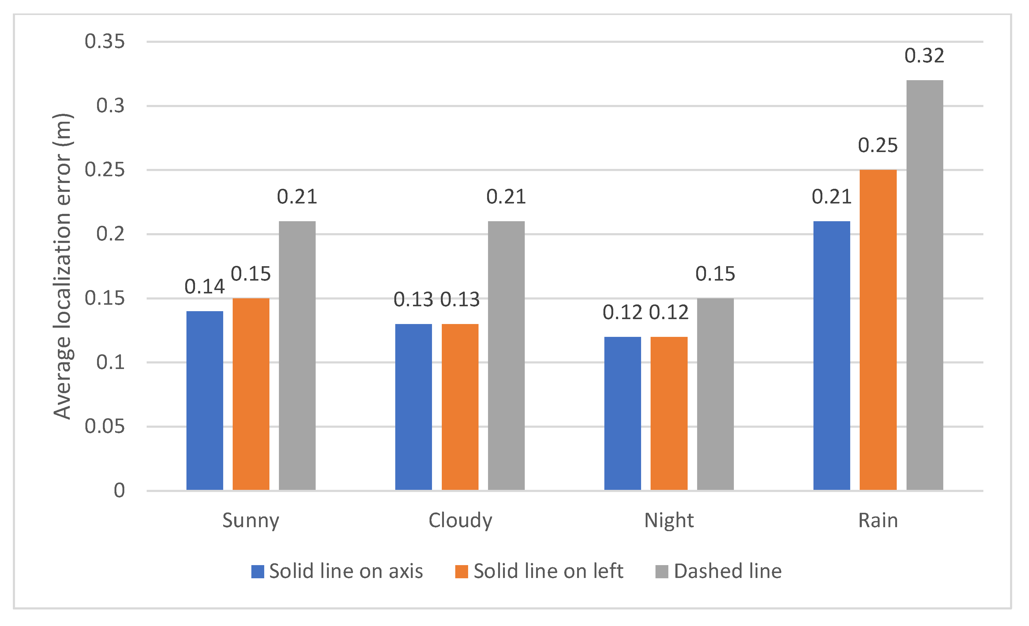 Figure 10, the largest deviation occurred during rainy conditions. Based on line type, the worst orientation was observed with the dashed line under any weather condition. This is a logical outcome, since the detected element is intermittent, making it more challenging for the system to detect it optimally, which increases deviation. Very favorable results were observed during nighttime testing, where the reflectivity of the element significantly contributed to its detection. Regarding the solid line along the vehicle axis and the solid line to the left of the vehicle, the results were very similar.