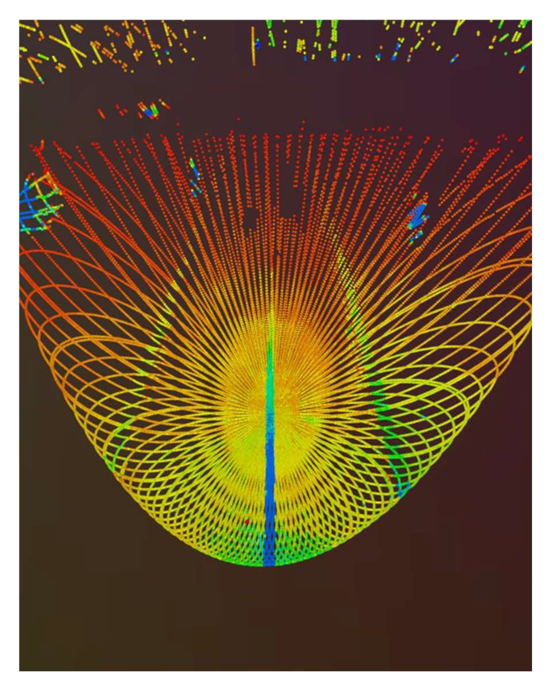 Figure 12, the virtual track (blue band) is clearly visible. Therefore, the colored bands are not arbitrary; they serve to visualize numerical values in the LiDAR scanning data, enabling a rapid distinction between varying object heights or reflection intensities.
