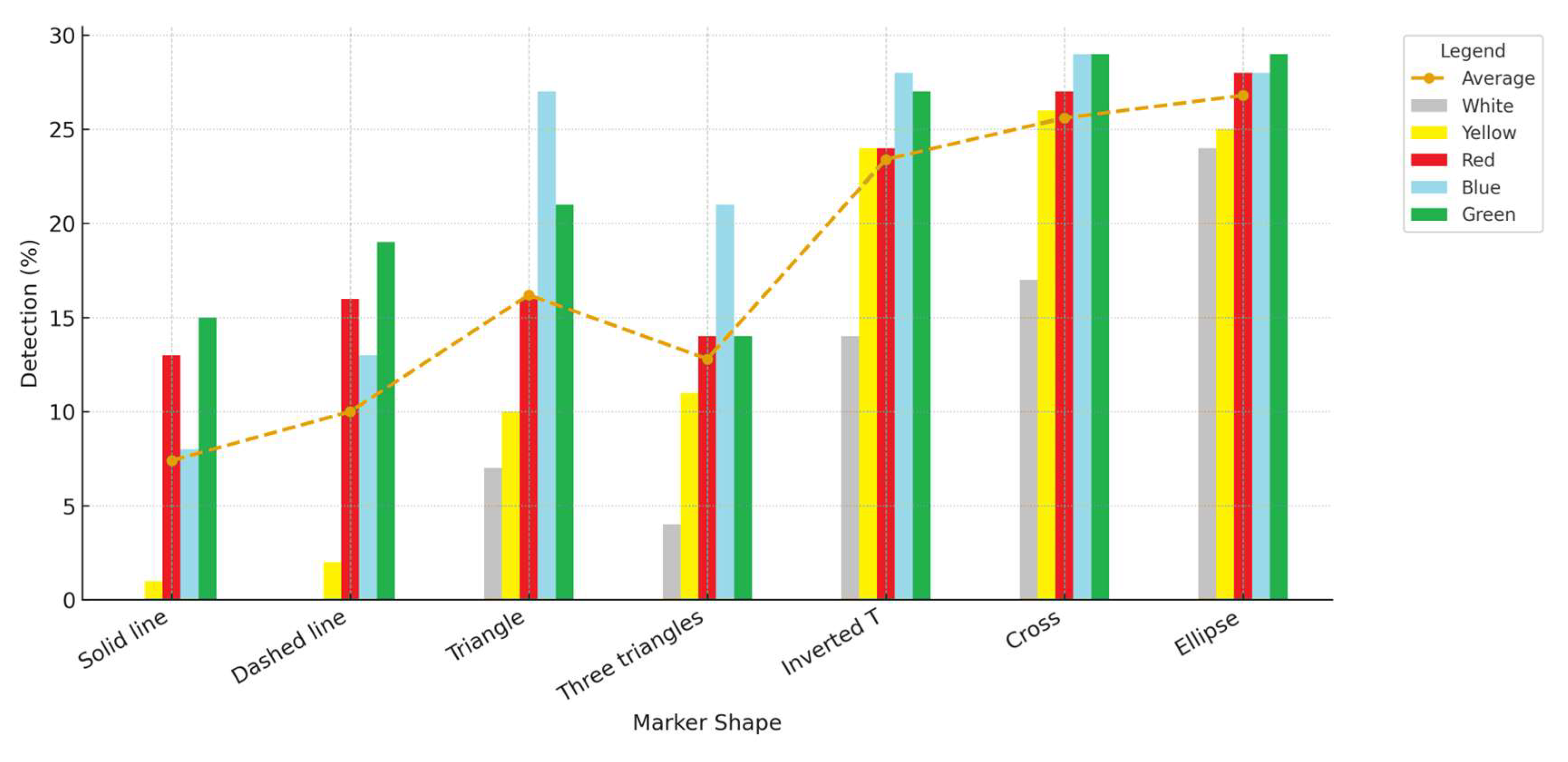 Figure 17). Participants were always able to distinguish these objects from horizontal traffic signs. The poorest results were observed for the solid and dashed lines, regardless of color. According to the participants, these lines were easily confusable with standard horizontal traffic markings.