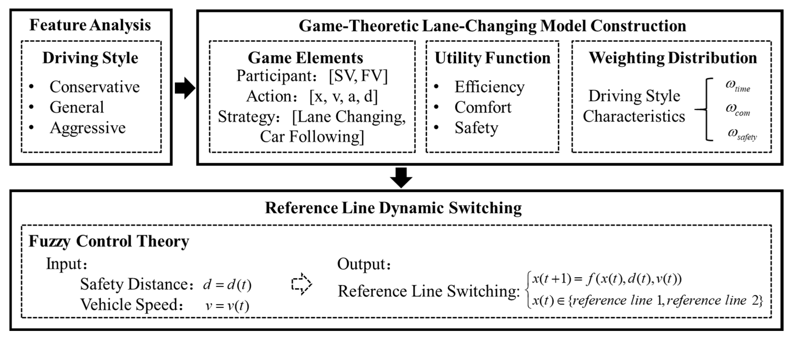 33], this research introduces an integrated model that combines driving style characteristics, game theory, and a dynamic reference line-switching mechanism. By analyzing driver behavior and incorporating a multi-agent decision-making process, the framework enables multi-objective co-optimization of safety, comfort, and traffic efficiency in complex scenarios. The model’s effectiveness has been validated in simulation environments. However, its parameters are highly dependent on typical driving scenarios, and its adaptability to extreme or uncertain traffic conditions requires further validation through real-world testing.