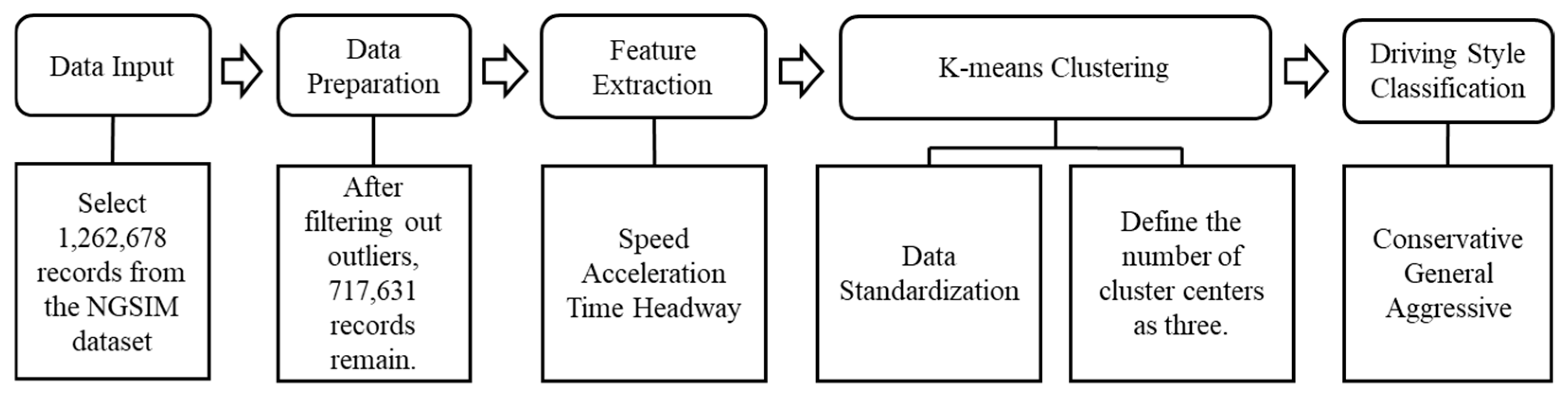 11] to represent and quantify driving behavior effectively. Several studies have been conducted on this topic. In the field of driving style research, several studies have proposed methods for recognizing and categorizing driving styles. For example, Deng et al. developed a driving style recognition method based on ensemble learning and enhanced clustering analysis. By combining the iForest anomaly detection algorithm with the Bisecting K-Means clustering technique, they identified three driver types: cautious, average, and aggressive [