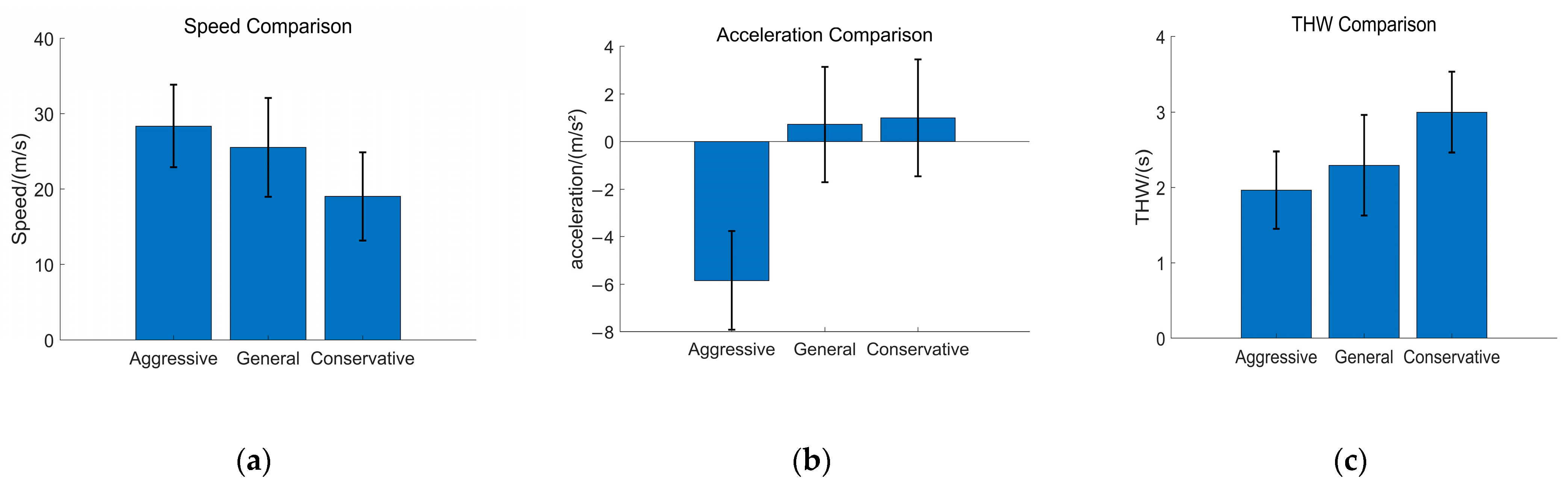 Driving style reflects a driver’s inherent risk perception, aggressiveness, and operational habits. These traits influence both longitudinal following behavior and lateral lane-changing decisions. This study quantitatively examines the behavioral differences among three distinct driving styles. Aggressive drivers tend to have higher average speeds, greater acceleration, and shorter headways, prioritizing travel efficiency. General drivers strike a balance between comfort and efficiency, maintaining moderate speeds, steady acceleration, and medium headways. Conservative drivers prioritize safety, opting for lower speeds, minimal acceleration, and maximum headways.