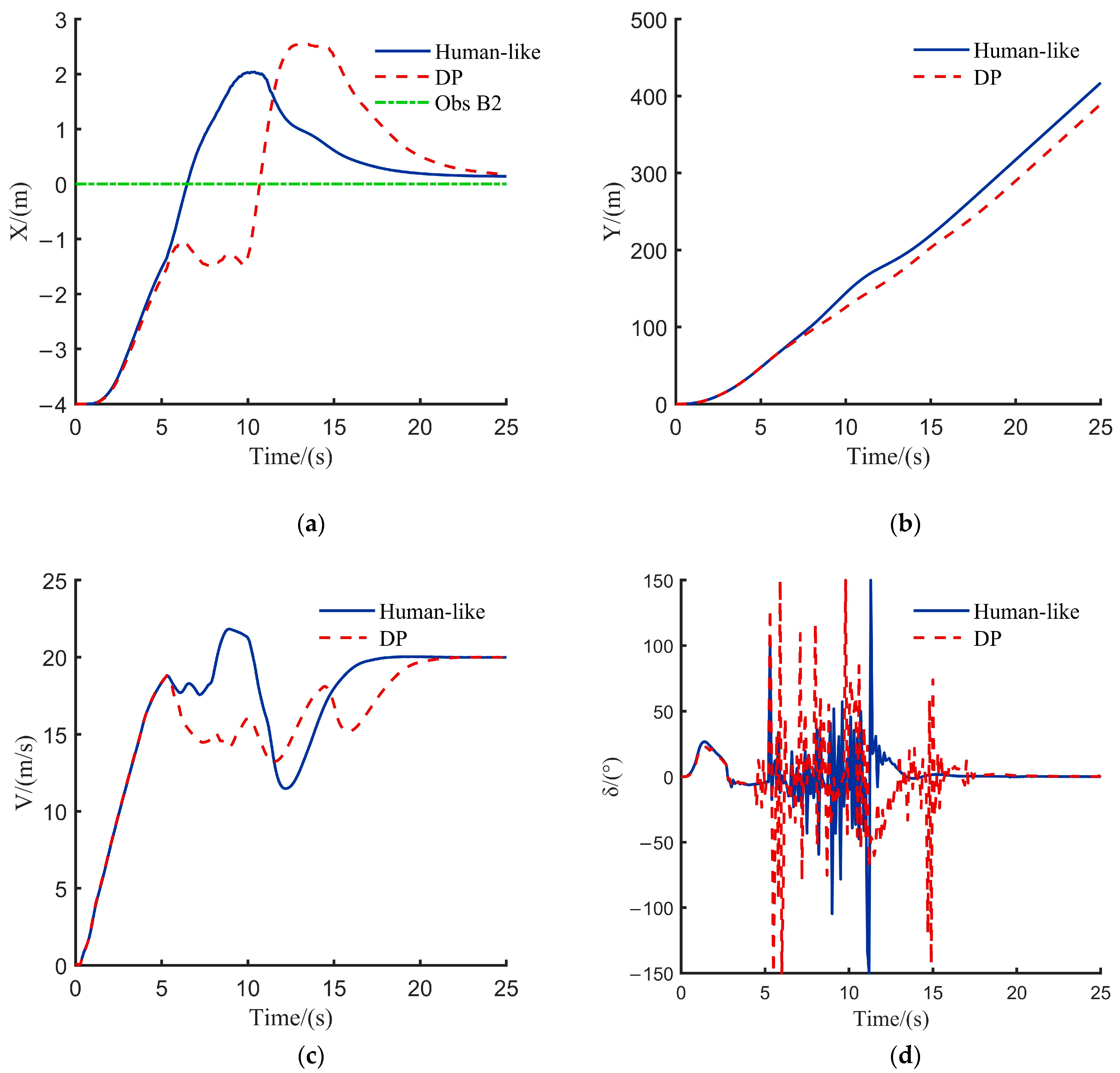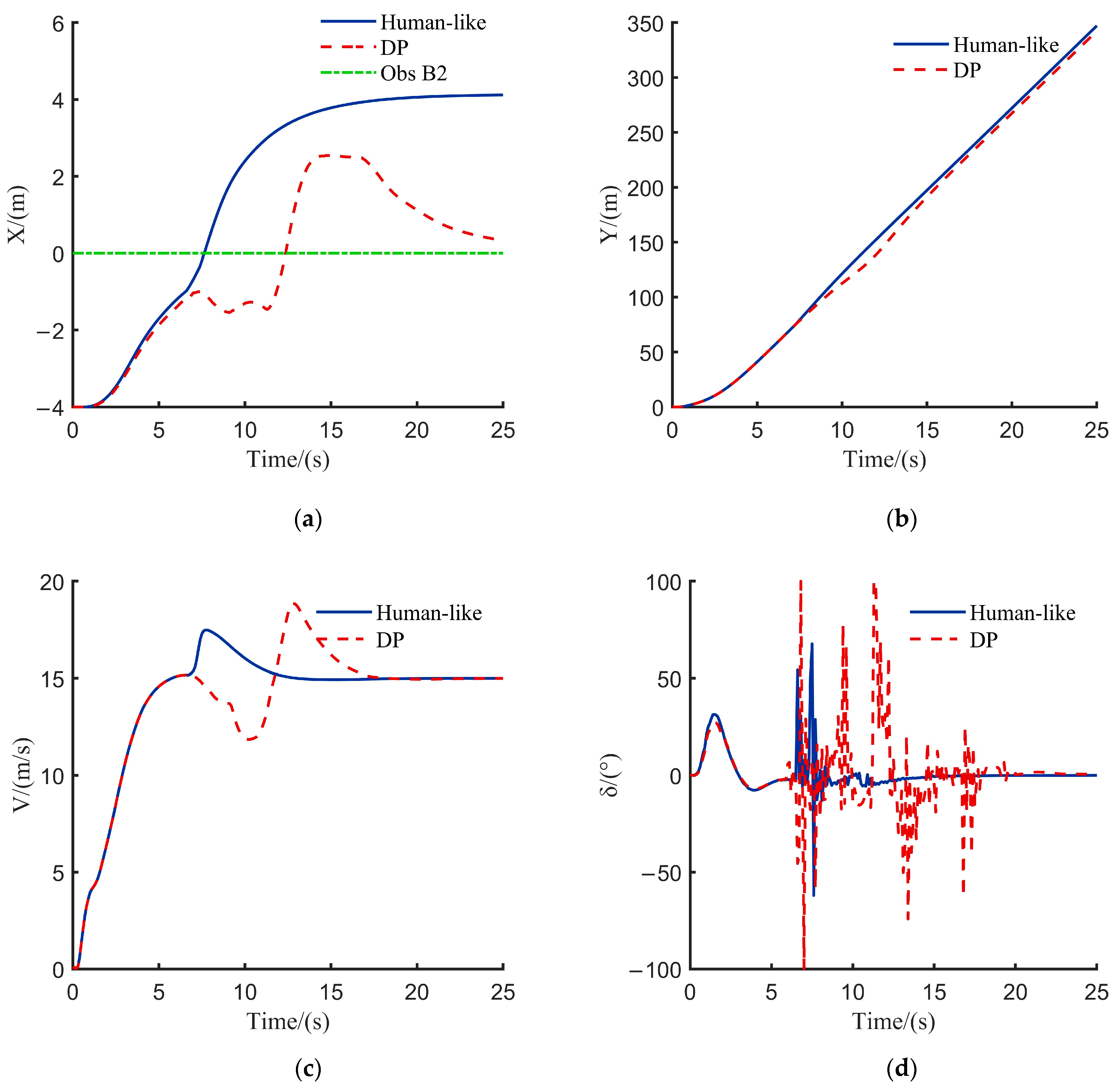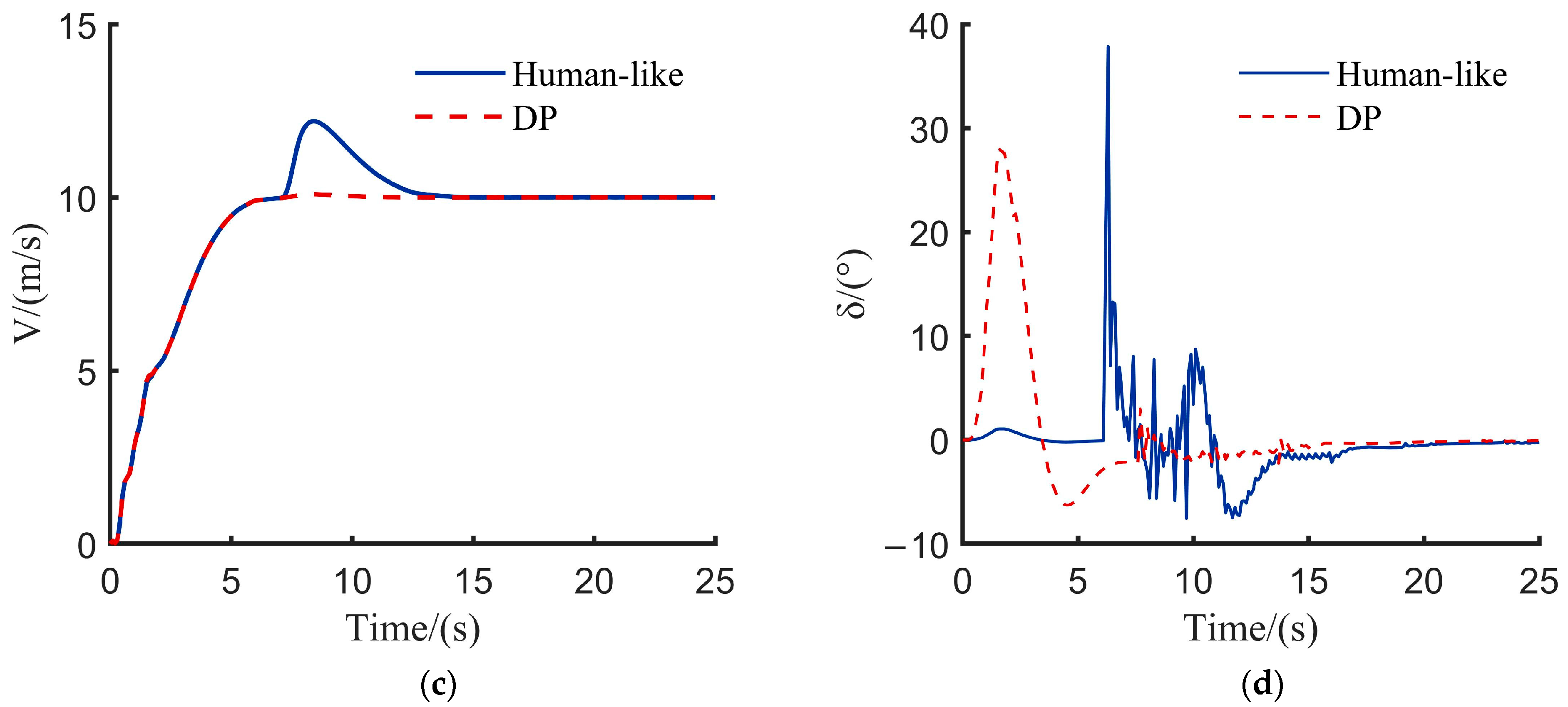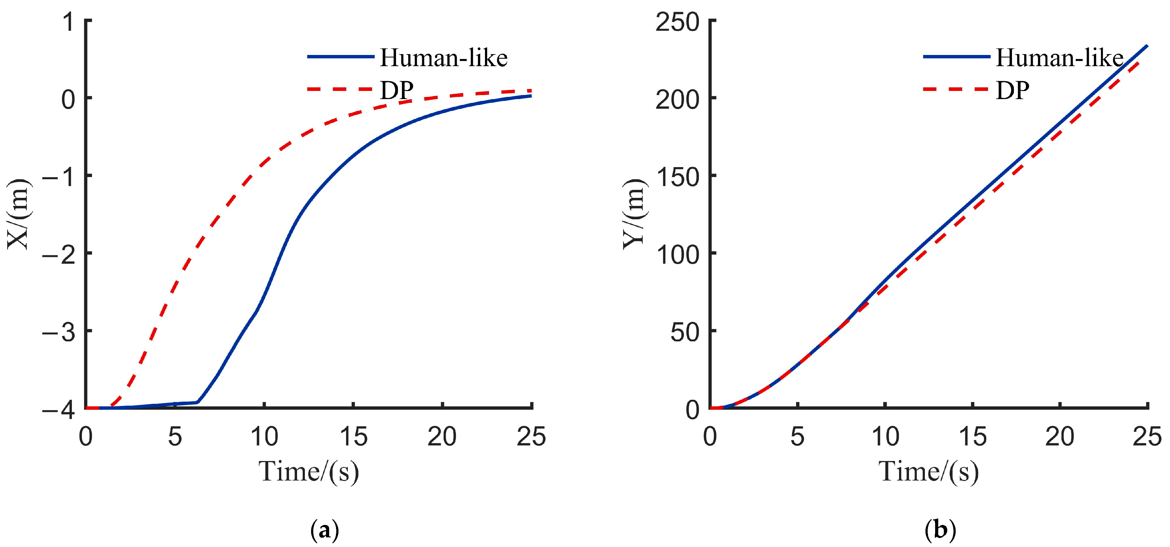 Simulation results highlight the key difference in decision-making intelligence between the two models. The dynamic programming model’s rigid lane-change decision at t = 2 s exposes the limitations of its ‘open-loop optimization’ approach, which fails to adapt to environmental changes after the decision, thus posing safety risks. In contrast, the anthropomorphic model’s dynamic reference line switching mechanism employs a ‘closed-loop probing’ strategy. By introducing a continuous evaluation phase during decision-making, this mechanism simulates the human driver’s cognitive process of confirming safety windows. It builds decision confidence on ongoing data rather than a single calculation, significantly enhancing decision robustness. The subsequent active deceleration after the lane change further demonstrates the control system’s closed-loop feedback capability, enabling a smooth and safe transition from ‘completing an action’ to ‘achieving a safe, stable state.’