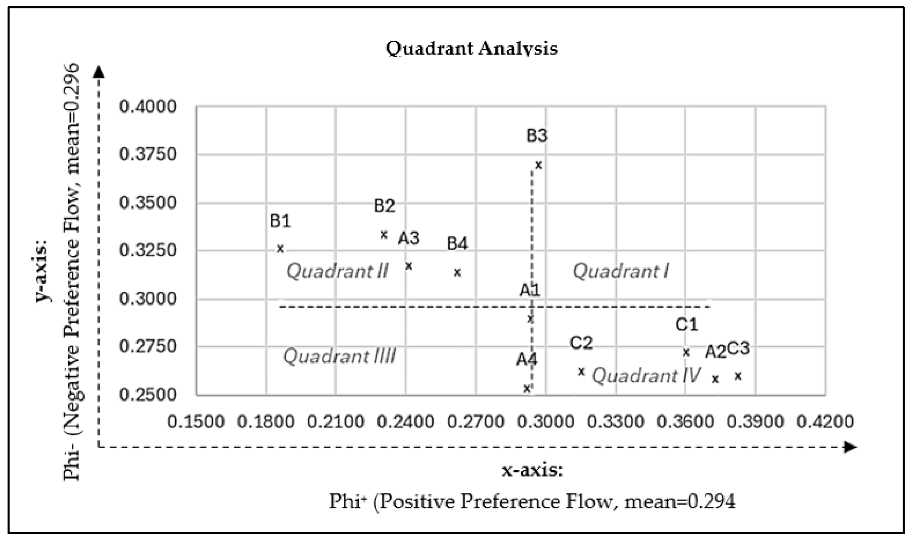 - Quadrant I (high benefits, high risks): B3 (Mobility Hub Charging System) combines above-average benefits (Phi+ = 0.296) with comparatively high risks (Phi− = 0.370), yielding a negative net flow (Phi = −0.074). Despite its lower overall rank, its position indicates optimisation potential, as targeted mitigation of the dominant risks could shift B3 towards Quadrant IV.