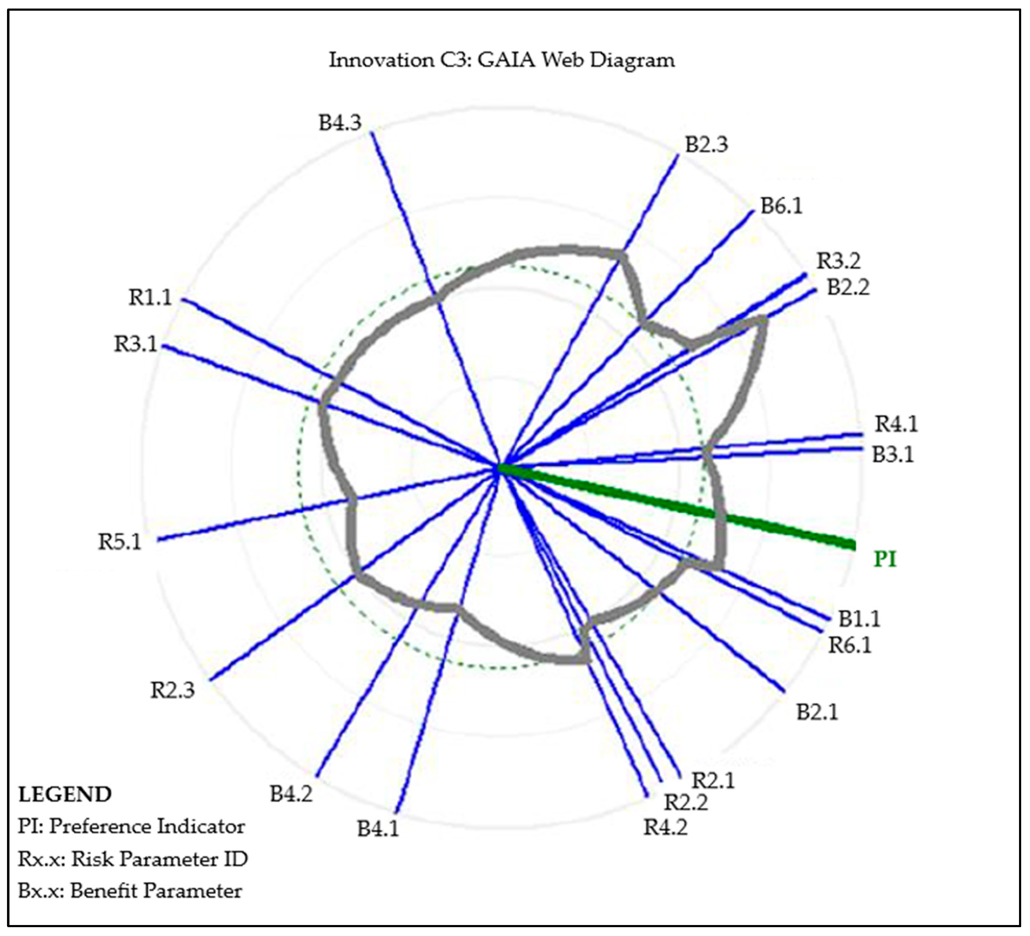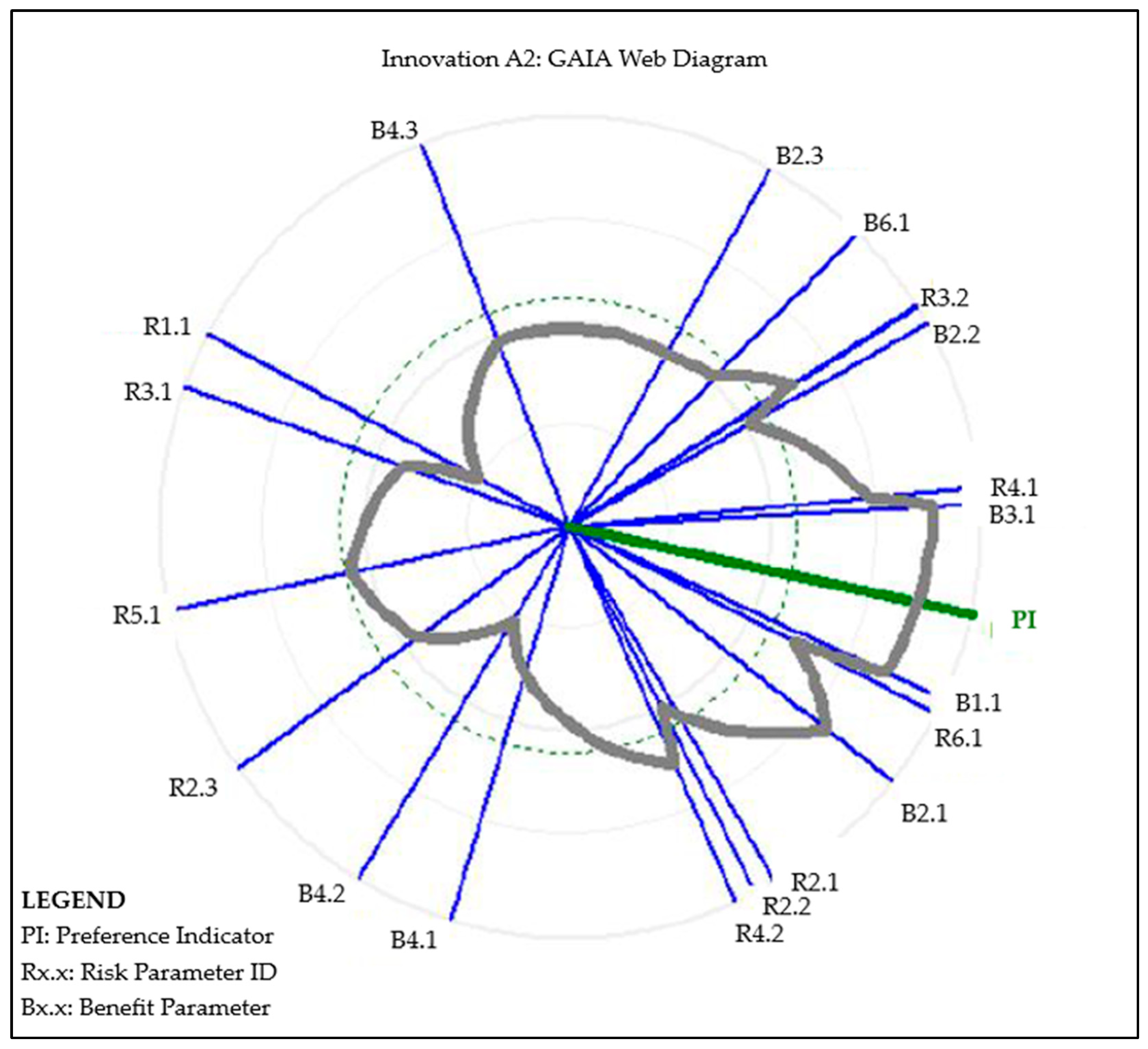 - Quadrant II (low benefits, high risks): B1, B2, A3 and B4 exhibit below-average benefits and above-average risks, consistent with their negative SOI values. For example, B1 (Bi-directional Modular Charging/B2G) records the lowest net flow (Phi = −0.140) due to safety, standards-alignment and integration concerns, while B2 (Hybrid Charging with Stationary Buffer) is penalised by environmental burdens (e.g., added components/waste) despite grid-management advantages. Innovations in this quadrant are the least favourable for near-term deployment and require substantial redesign or risk mitigation measures.