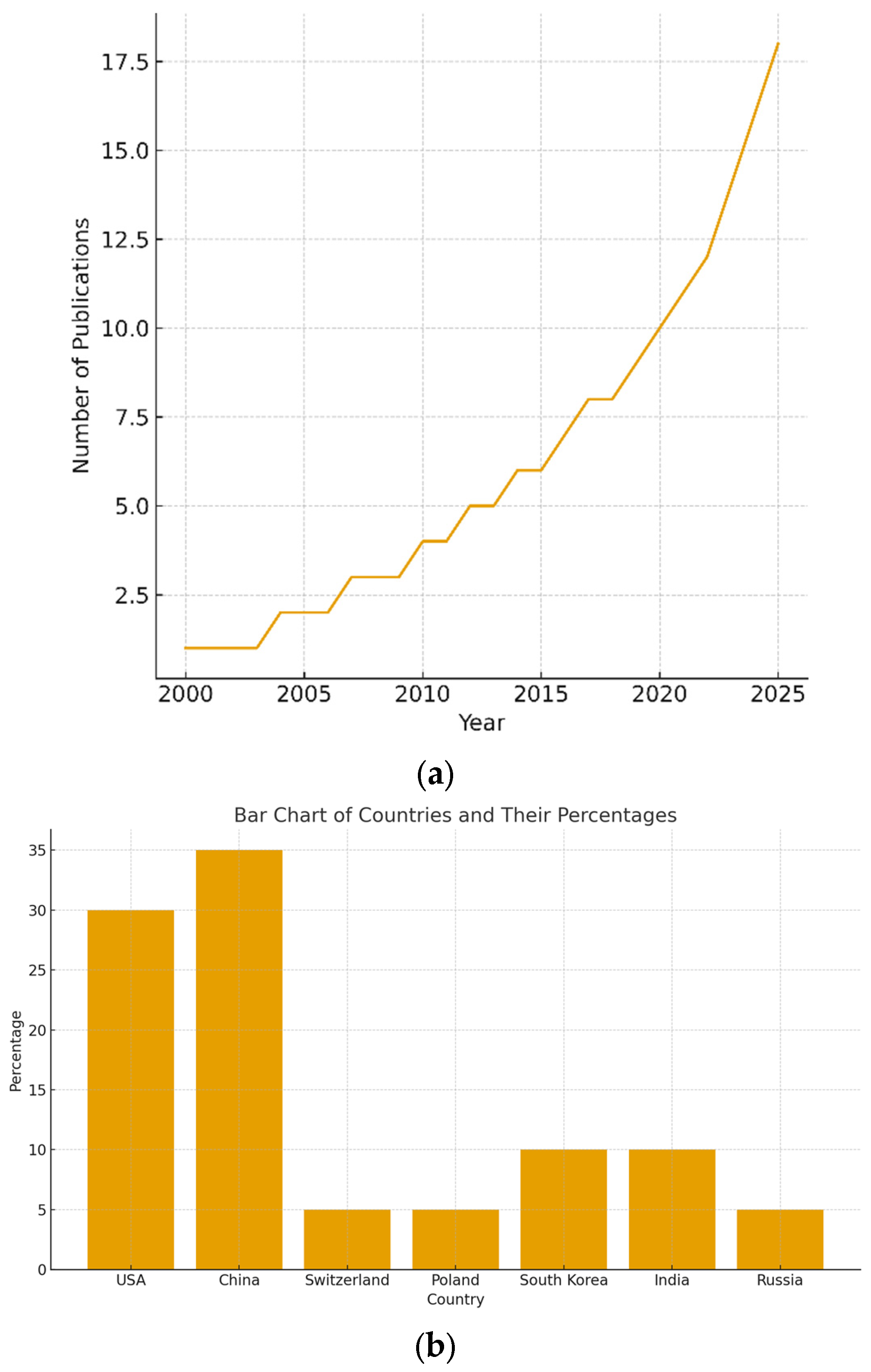 - In the 2020s: Recent Developments. The past few years have seen a surge of interest in HGMBs, driven by the needs of cryogenic electrical machines, high-speed generators, and hydrogen economy applications. Liu et al. in 2021 [46] published an extensive review summarizing the state-of-the-art in HGMB theory, simulations, and experiments up to 2020. They highlighted inherent challenges in design, analysis, and control that needed to be solved for reliable operation. Building on this, researchers have proposed single-structured HGMBs, where a single device acts as both a gas and magnetic bearing, eliminating duplicate components. Falkowski et al. in 2022 [45] present a detailed study on the design of magnetic bearings specifically for electric jet engine rotors. By 2024, Liu et al. [50] introduced a single-structure HGMB tailored for high-speed cryogenic turboexpanders, such as hydrogen liquefaction turbines. This design integrates the magnetic poles as the journal for the gas bearing, drastically simplifying the assembly and raising the system’s critical speeds. The proposed HGMB design used one bearing at each end of the rotor, each bearing being both magnetic and gas journal. Simulation and analysis verified that the design could support the rotor throughout its operating map and offered simpler construction and higher critical speeds than an equivalent foil bearing design. Ha et al. in 2024 [51] investigated the application of an Integrated Hybrid Air-Foil Magnetic Thrust Bearing (i-HFMTB) in a 250 HP air compressor system. Their work demonstrated that conventional air-foil journal bearings often suffer from rigid-mode instabilities, such as sub- and super-synchronous vibrations, which can limit system performance and reliability. By combining the passive load-supporting capacity of air-foil bearings with the active vibration control of magnetic bearings, the i-HFMTB successfully suppressed these instabilities. Concurrently, advanced modeling in 2025 quantified the performance trade-offs (like clearance effects) to guide HGMB optimization. These latest works mark a transition of HGMBs from experimental novelty towards practical design methodologies for aerospace applications. Figure 2 shows some information about the number of papers and countries that conducted the studies on HGMBs in aerospace motors.