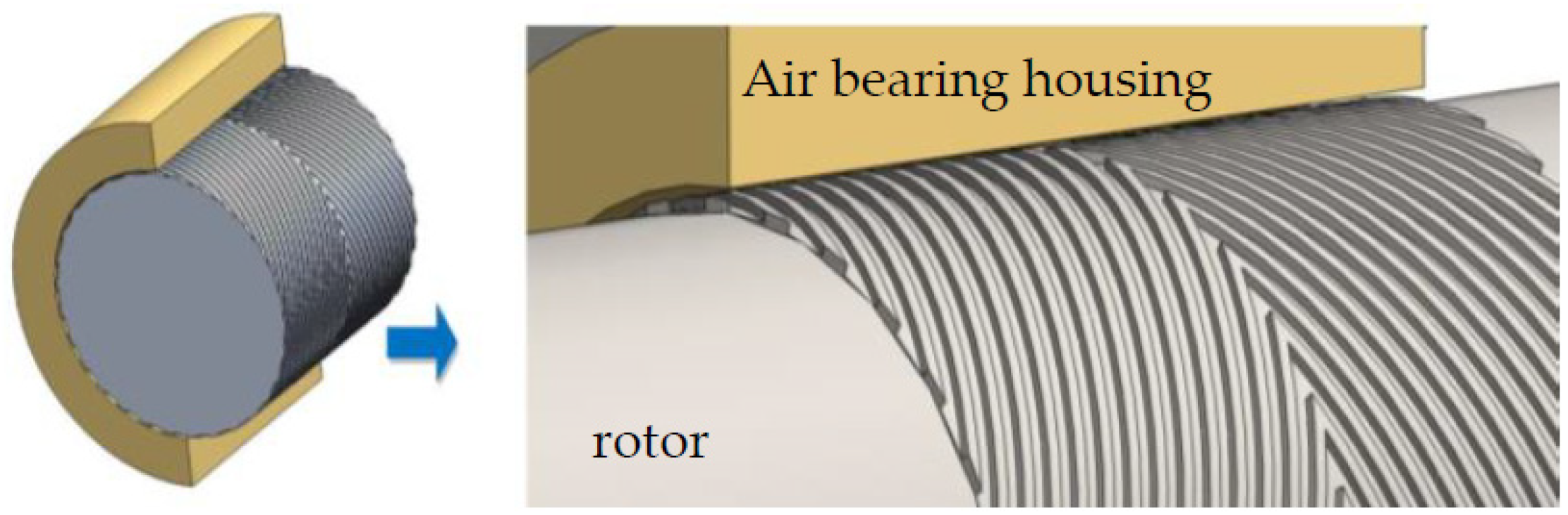 - Integration with Motors: A future direction is integrating HGMB with the propulsion electric motor itself. For instance, an axial gap motor could conceivably incorporate a gas film in the gap and use the motor windings for cantering at low speeds. Liu et al. [50] study basically went in this direction by choosing an axial generator to complement the bearing design. Such integration can yield ultra-compact and efficient designs, but would require joint optimization of electromagnetic torque and suspension forces.