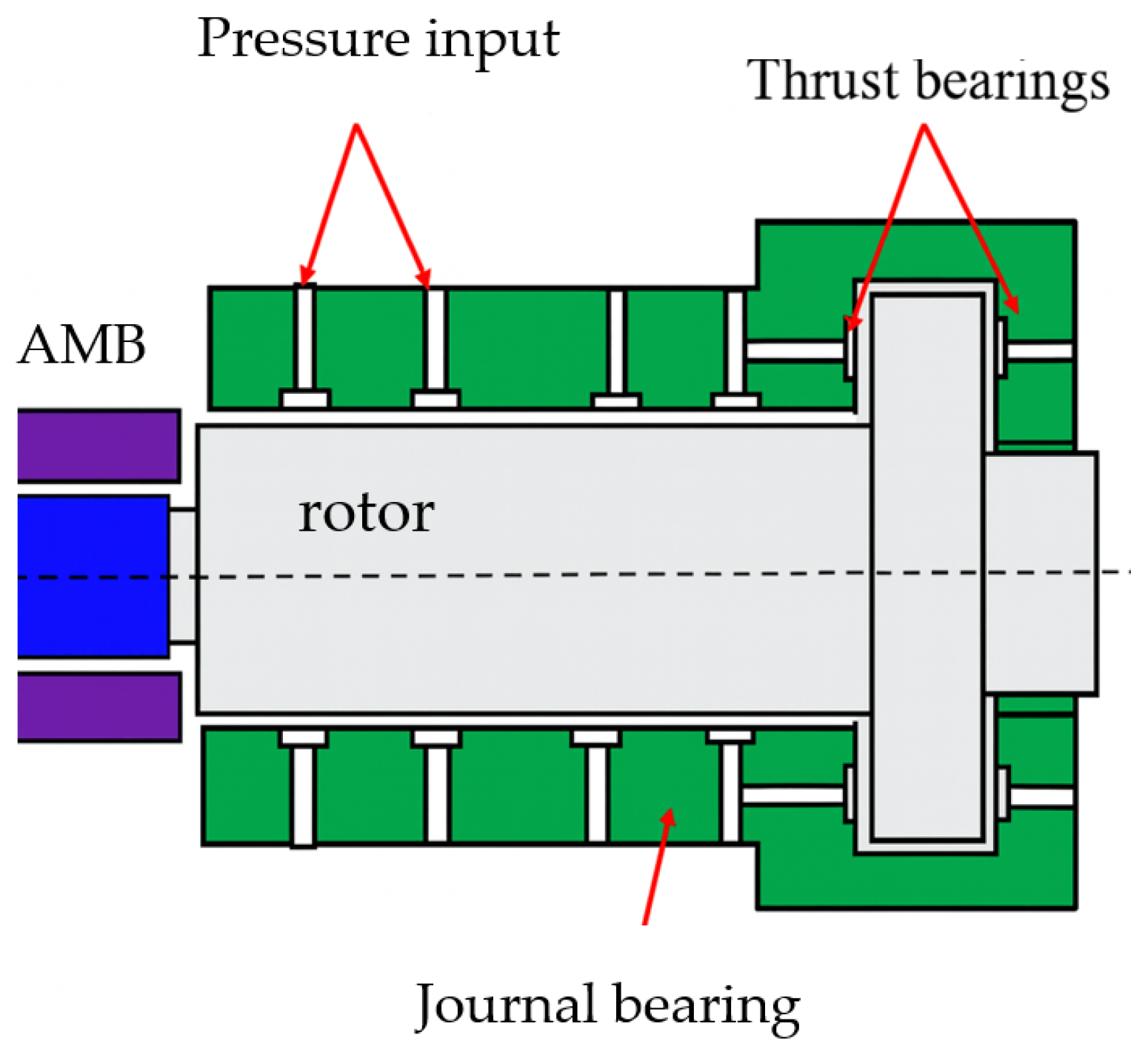 - Liu, Q.; Ahn, H. Hybrid Gas-Magnetic Bearings: An Overview. J. Appl. Electromagn. 2021, 53, 123–145. [Google Scholar] [CrossRef]