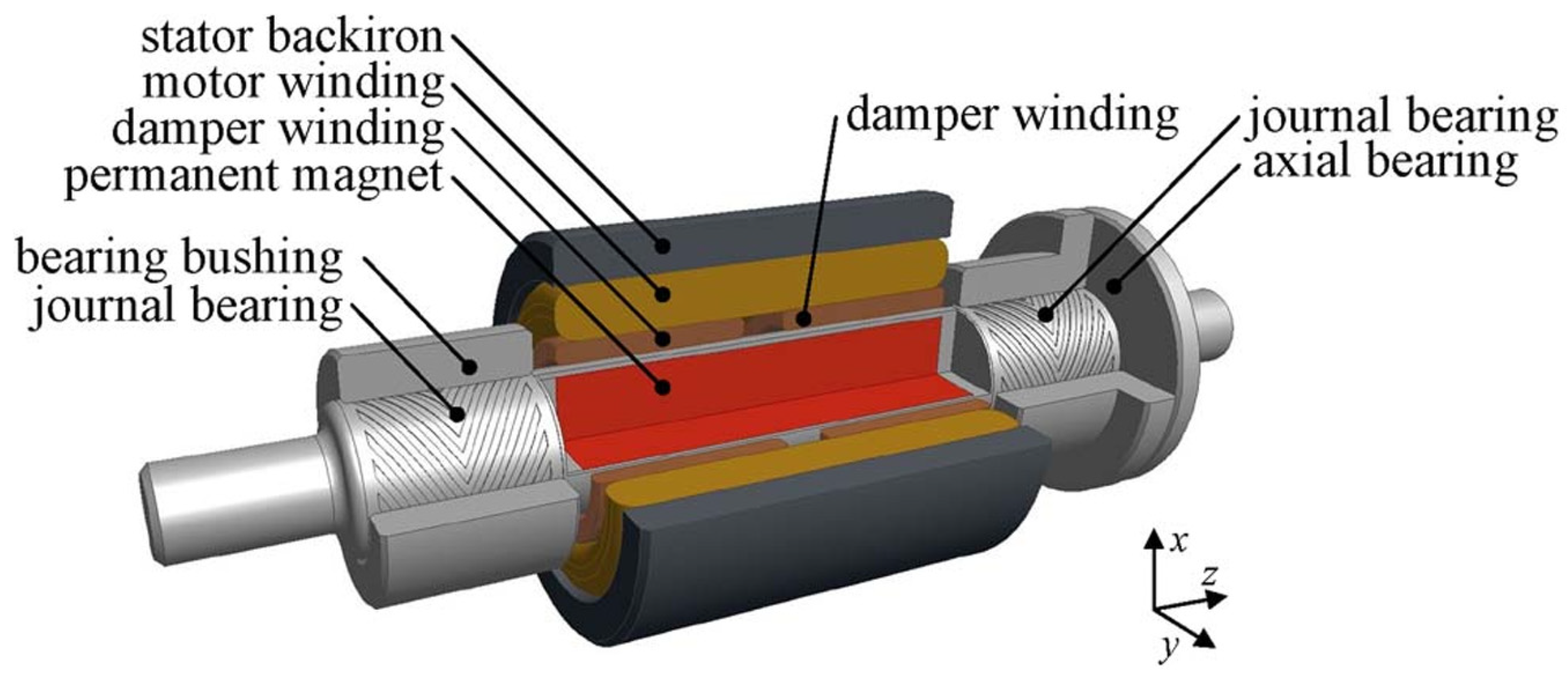 - Nested or Concentric Bearings: An early approach is to physically collocate a gas bearing and a magnetic bearing around the same rotor journal. The nested layout saves space (shorter rotor length than two separate bearings) and was used in several prototypes. However, it requires a fairly complex construction (embedding foil pads within a magnetic circuit) and precise alignment [52,59].