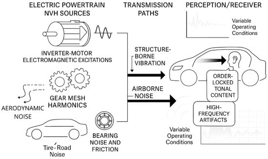 Noise, Vibration, and Harshness (NVH) in road vehicles concerns the generation, transmission, and perception of tonal and broadband phenomena arising from powertrains, driveline elements, tires, and aerodynamics (Figure 1). In battery-powered electric vehicles (EVs), the masking effect of the internal combustion engine is absent, so inverter–motor electromagnetic excitations and gear mesh harmonics become more salient, shifting the diagnostic emphasis toward order-locked content and high-frequency artifacts that must be characterized under variable operating conditions. Recent surveys highlight this transition and call for standardized, reproducible evaluation under realistic noise and speed variability, particularly for EV drivetrains [1,2,3].
