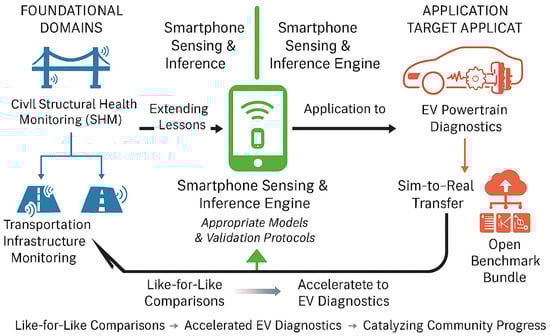 The paper situates itself within the growing evidence that smartphone sensing can support serious engineering inference when paired with appropriate models and validation protocols, extending lessons from civil SHM and transportation to the automotive NVH domain (Figure 2). By releasing an open bundle designed for edge feasibility, the study looks to catalyze like-for-like comparisons and speed up sim-to-real transfer in EV diagnostics [13,14].