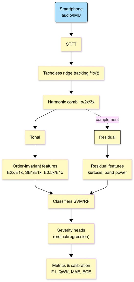 Tacholess (OT) coupled with order-invariant ratios improves robustness and explainability because order energy and sidebands drift with speed; without an RPM reference, features computed in fixed frequency bins smear across time–frequency. By recovering a smooth estimate of the fundamental ridge f1X(t) and applying an adaptive comb, OT recenters harmonics and stabilizes their amplitudes before feature computation, while the complementary residual channel isolates impulsive phenomena characteristic of looseness-type faults. These effects echo recent OT literature in which inverse-STFT/SVD strategies, multi-frequency trackers, and adaptive comb filters under variable speed improve separability of fault signatures during run-ups and run-downs. The proposed pipeline adopts a compute-light, deterministic variant of those ideas—explicit ridge tracking plus harmonic masking—precisely to favor portability to commodity phones and repeatability across sites.