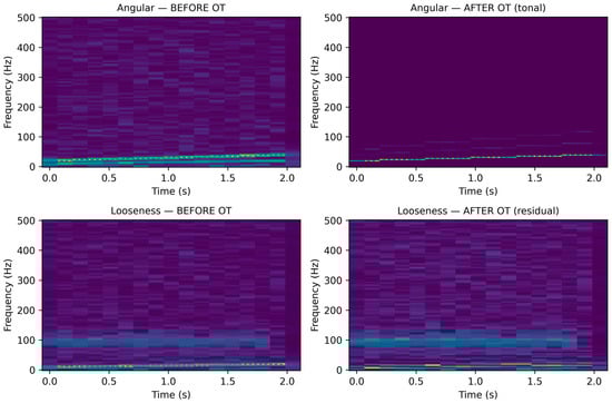 Angular misalignment, spectrogram (before). Raw STFT magnitude with a visible ridge near 1X and energy around 2X; noise and profile dynamics blur the ridge. Angular misalignment, spectrogram (after OT). Tonal component after ridge-guided masking. The 2X band is sharpened and stabilized along the tracked f1X(t). Looseness, spectrogram (before). Raw magnitude showing broadband bursts; tonal orders are present but partially masked by impacts. Looseness, residual (post-tonal). Non-tonal residual after removing 1X/2X/3X bands. Impact trains become salient, increasing residual kurtosis and band-power in the 600–1200 Hz band.