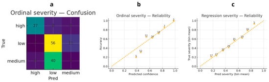 - Regression (0–1): Random Forest regressor; reliability assessed by binning predictions and comparing mean predicted vs. mean observed severities.