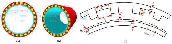 where Q, , , and represent the number of stator slots, the number of rotor pole pairs, the number of stator winding pole pairs, and the gear ratio, respectively. Based on recent research, for MW-level applications, a low gear ratio offers more advantages for Vernier machines. This paper designed and analyzed a DTP-PMVM with , , and , the resulting gear ratio is , as a low gear ratio with acceptable performance in MW in ship propulsion based on the previous work [44]. In the PMVM with , PMs create the air-gap field, which is modulated by the stator slots. This modulation results in an effective field that rotates at a speed times higher than the rotor mechanical speed, effectively mimicking the operation of a gearbox and allowing for high torque generation at low speeds.