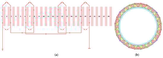 Winding structure in DTP-PMVM with . (a) winding diagram for one phase, and (b) winding connection of all six phases.