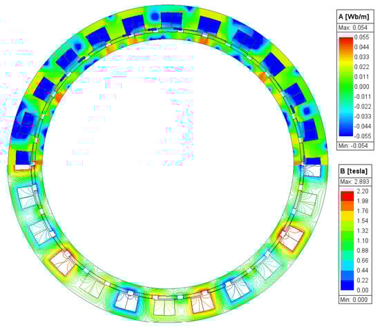 The full load analysis of the proposed DTP-PMVM is also performed, based on a rated current of 1610 A and a low current density of 2.96 A/m2 to make sure the machine operates without thermal issues, utilizing air-forced cooling. In addition, the thermal behavior of high-power propulsion motors is a critical factor that influences their operational reliability and lifespan. Recent advancements in battery and motor thermal management, such as micro-channel liquid cooling plate designs, provide promising solutions for efficient heat dissipation in high-density power systems [45]. The full load flux distribution is shown in Figure 4, where the flux path lines and flux density can be observed. The results indicate that the core is not saturated, even with the use of a very thin back iron, demonstrating that the machine operates effectively. The primary purpose of designing the DTP-PMVM is to enhance redundancy in ship propulsion. To evaluate this, the DTP-PMVM is tested under full-load and open-circuit conditions. The torque performance of the DTP-PMVM is assessed in both healthy conditions and with one winding set open-circuited, as shown in Figure 5. Under open-circuit conditions in one winding set, the proposed DTP-PMVM operates at half of the rated power with an acceptable ripple torque of less than 5%. All electromagnetic performance parameters of the proposed DTP-PMVM are presented in Table 2.