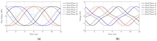The no-load analysis of the proposed DTP-PMVM is performed using FEM-based Motor-CAD analysis at the rated speed of 300 rpm. The induced voltage and flux linkage of all phases under no load conditions are shown in Figure 3, respectively. Under no load conditions, all six phases are balanced and symmetrical, with a 30-degree phase shift between the two winding sets, demonstrating the correct design and configuration of the dual three-phase system.