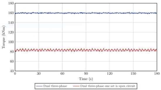 Torque comparison of the DTP-PMVM in healthy conditions versus when one winding set is open-circuited.