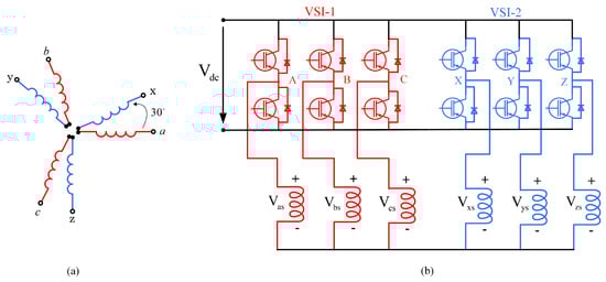 (a) Asymmetrical arrangement of winding in DTP-Machine; (b) single neutral topology Voltage Source Inverter(VSI)-fed DTP-PMSM drive with stator winding connection. Reprinted with permission from Ref. [41]. 2023 IEEE.