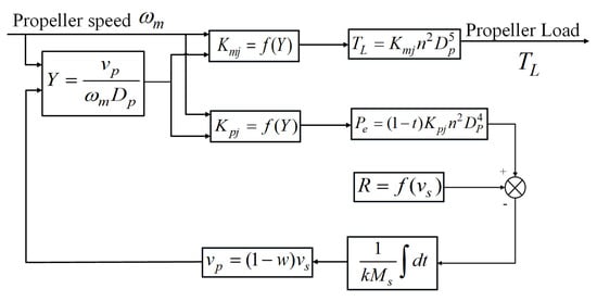 The electrical system in a vessel with electric propulsion typically includes an onboard power system (an electric generator, distribution system, frequency converters, transformers, and switchboards for the distribution system). Figure 8 shows a condensed overview of the electrical systems in a ship using electric propulsion, illustrating the effects of various load conditions or load effects, such as the ocean environment, ship hull, and ship velocity, on the control of the propulsion motor [41]. Figure 9 describes the mathematical model for the propeller dynamic load [52]. The parameters of the propeller model are listed in Table 3. In Figure 9, Y is the propeller advance number, is the ship advance speed, is the ship efficient thrust force, is the resistive drag, and is the ship speed without considering the wake fraction, w, and it is bigger than [53].