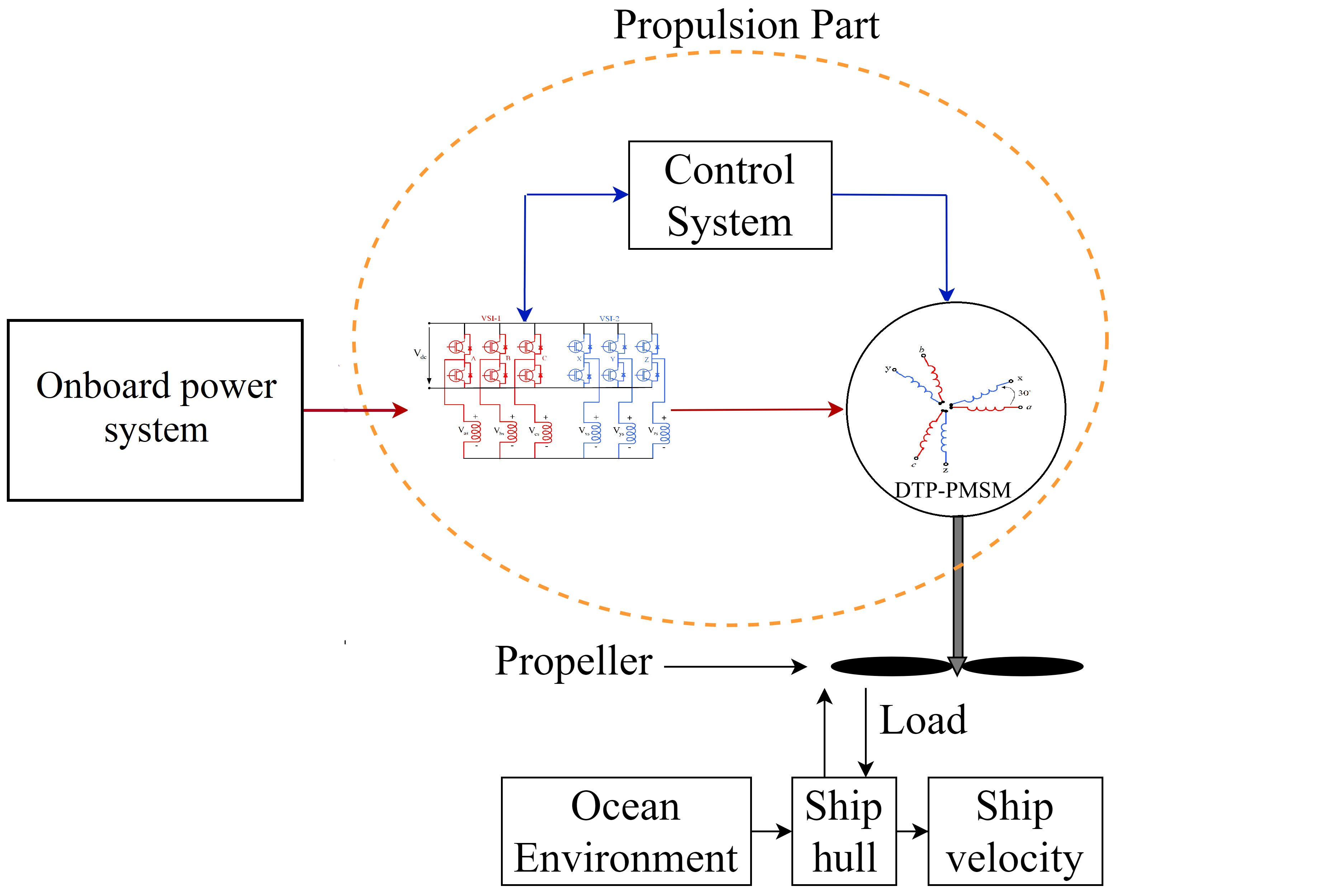In the ship propulsion industry, achieving a certain level of redundancy is crucial for improving safety, reliability, and operational availability [1,2,3]. Several methods are employed to enhance redundancy in electrical drives, including (a) adding a backup system, (b) designing fault-tolerant drives, and (c) converting a single-drive architecture into multiple independent units, such as dual or triple systems [4]. Among these, the dual three-phase system is particularly promising, as it requires only minor modifications to the stator winding, offering a simpler and more cost-effective solution. Due to the increased number of phases in DTP-PMSMs, several innovative methods for rotor position estimation have been developed, highlighting specific advantages of DTP-PMSMs in sensorless control applications [5]. This paper presents an integrated approach that combines the design of DTP-PMVM with sensorless control techniques, setting a new standard for propulsion technologies in the maritime industry.