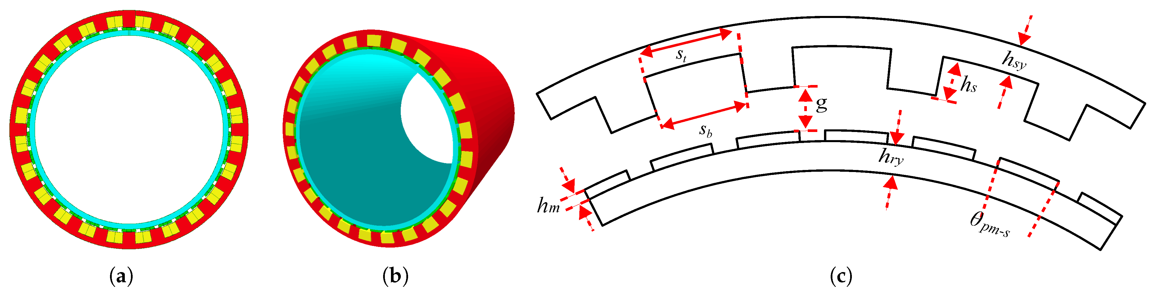 where Q, p r , p s , and G r represent the number of stator slots, the number of rotor pole pairs, the number of stator winding pole pairs, and the gear ratio, respectively. Based on recent research, for MW-level applications, a low gear ratio offers more advantages for Vernier machines. This paper designed and analyzed a DTP-PMVM with Q = 24 , p r = 17 , and p s = 7 , the resulting gear ratio is G r = 2.4 , as a low gear ratio with acceptable performance in MW in ship propulsion based on the previous work [44]. In the PMVM with G r = 2.4 , PMs create the air-gap field, which is modulated by the stator slots. This modulation results in an effective field that rotates at a speed G r times higher than the rotor mechanical speed, effectively mimicking the operation of a gearbox and allowing for high torque generation at low speeds.