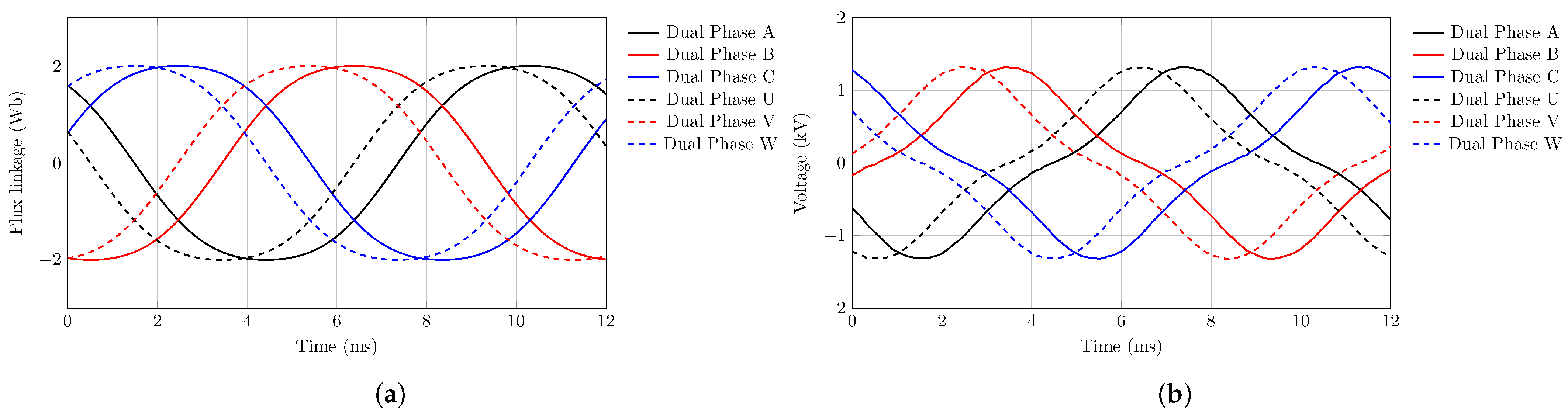 The no-load analysis of the proposed DTP-PMVM is performed using FEM-based Motor-CAD analysis at the rated speed of 300 rpm. The induced voltage and flux linkage of all phases under no load conditions are shown in Figure 3, respectively. Under no load conditions, all six phases are balanced and symmetrical, with a 30-degree phase shift between the two winding sets, demonstrating the correct design and configuration of the dual three-phase system.