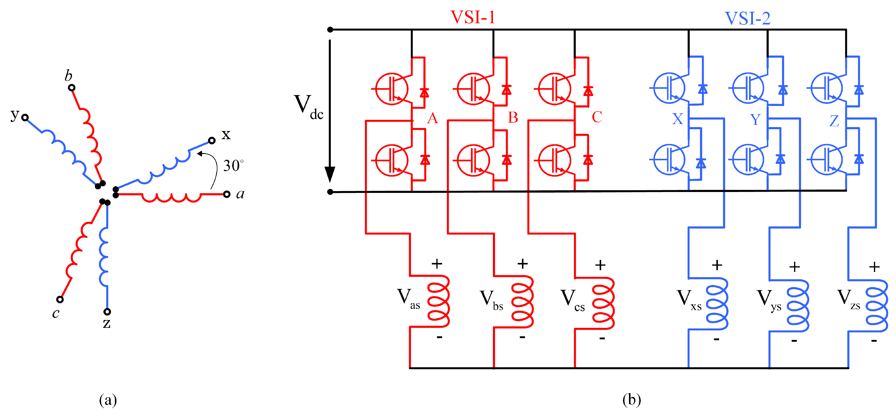 Figure 6. (a) Asymmetrical arrangement of winding in DTP-Machine; (b) single neutral topology Voltage Source Inverter(VSI)-fed DTP-PMSM drive with stator winding connection. Reprinted with permission from Ref. [41]. 2023 IEEE.