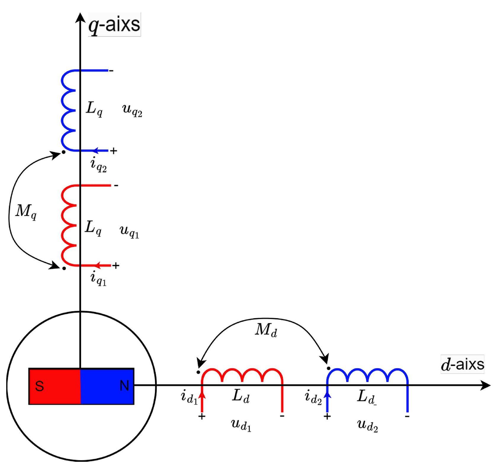 u d 1 u q 1 = R s + L d s ω e L q ω e L d R s + L q s i d 1 i q 1 + M d s ω e M q ω e M d M q s i d 2 i q 2 + 0 ω e ψ f d