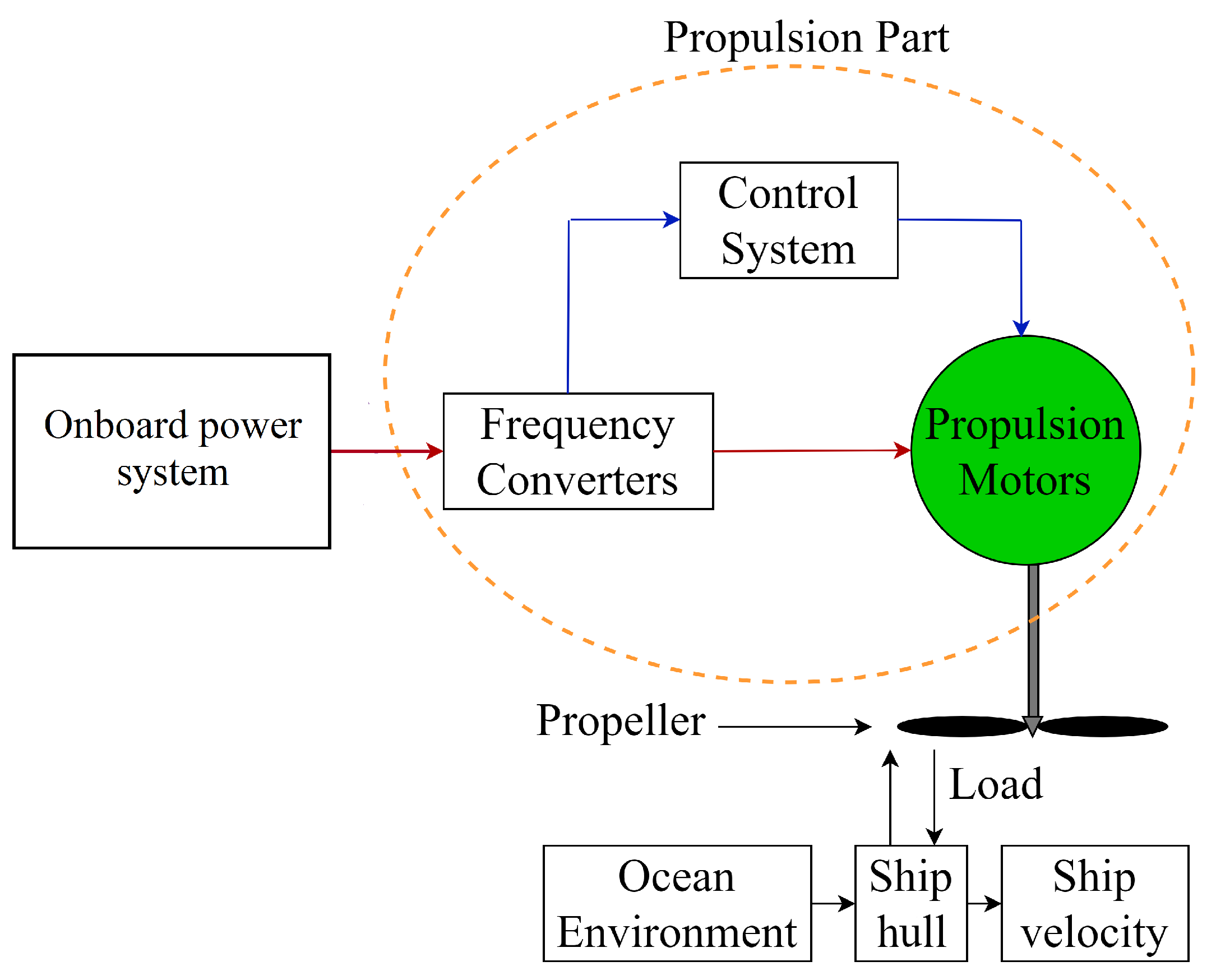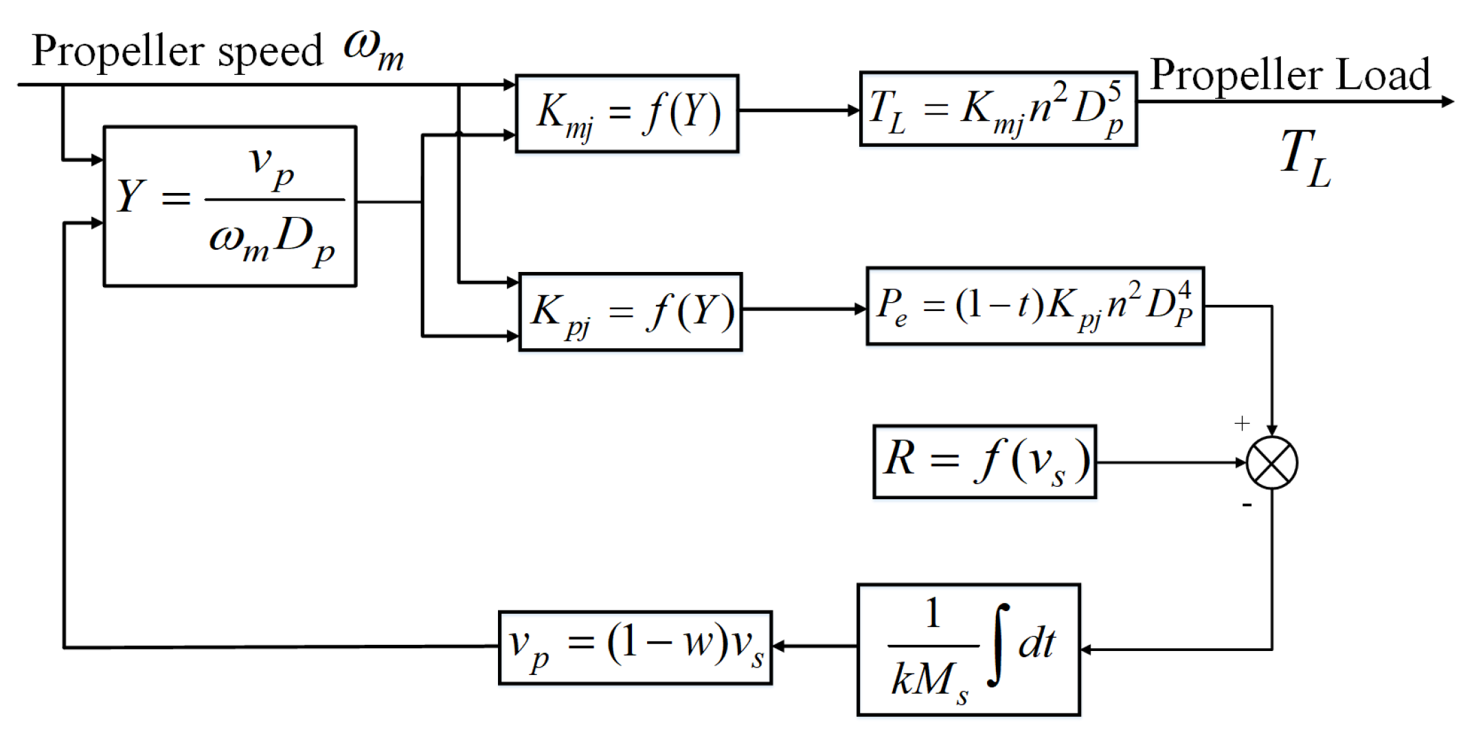 The electrical system in a vessel with electric propulsion typically includes an onboard power system (an electric generator, distribution system, frequency converters, transformers, and switchboards for the distribution system). Figure 8 shows a condensed overview of the electrical systems in a ship using electric propulsion, illustrating the effects of various load conditions or load effects, such as the ocean environment, ship hull, and ship velocity, on the control of the propulsion motor [41]. Figure 9 describes the mathematical model for the propeller dynamic load [52]. The parameters of the propeller model are listed in Table 3. In Figure 9, Y is the propeller advance number, v p is the ship advance speed, P e is the ship efficient thrust force, R f is the resistive drag, and v s is the ship speed without considering the wake fraction, w, and it is bigger than v p [53].