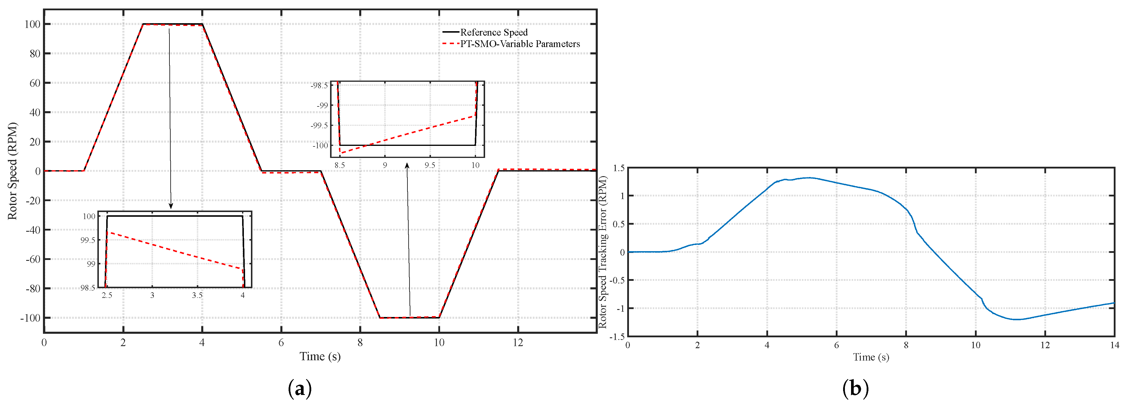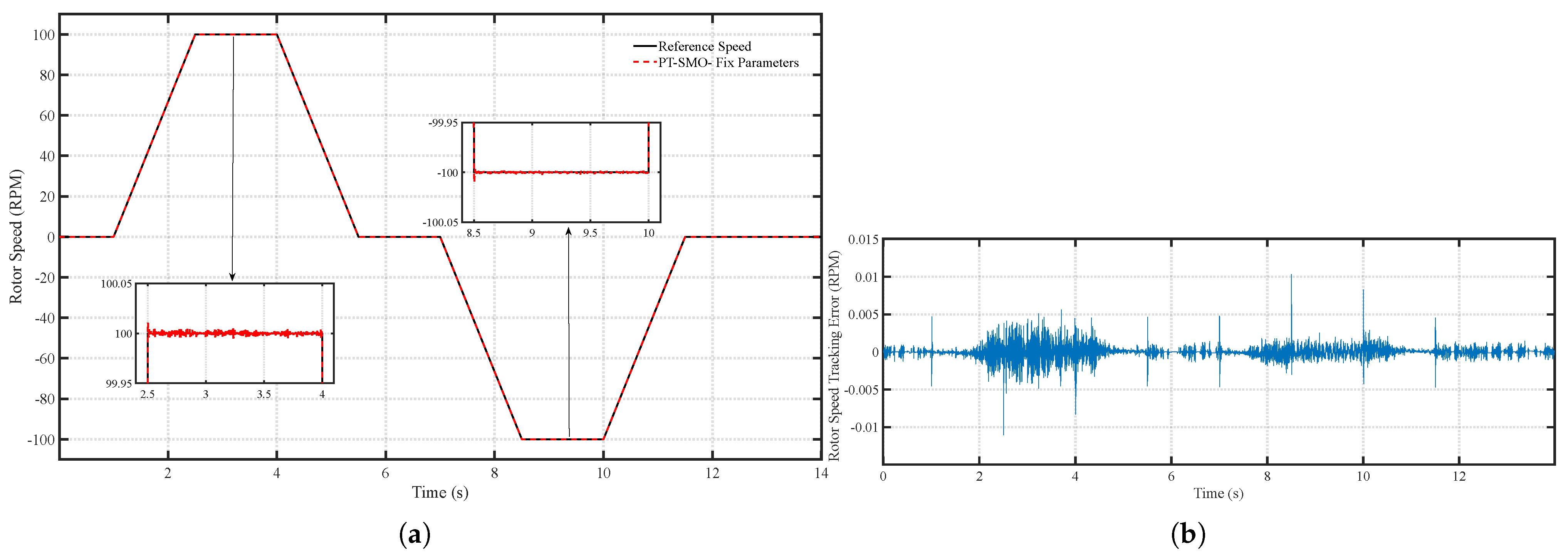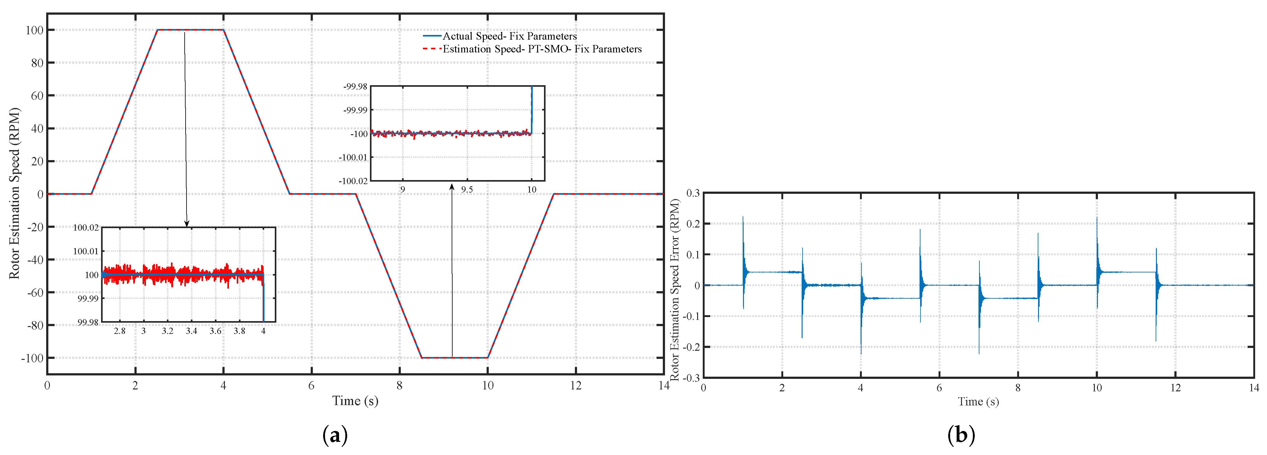 Figure 11. (a) Speed tracking performance of the PT-SMO under fixed parameters and (b) Speed tracking error of the PT-SMO under fixed parameters.