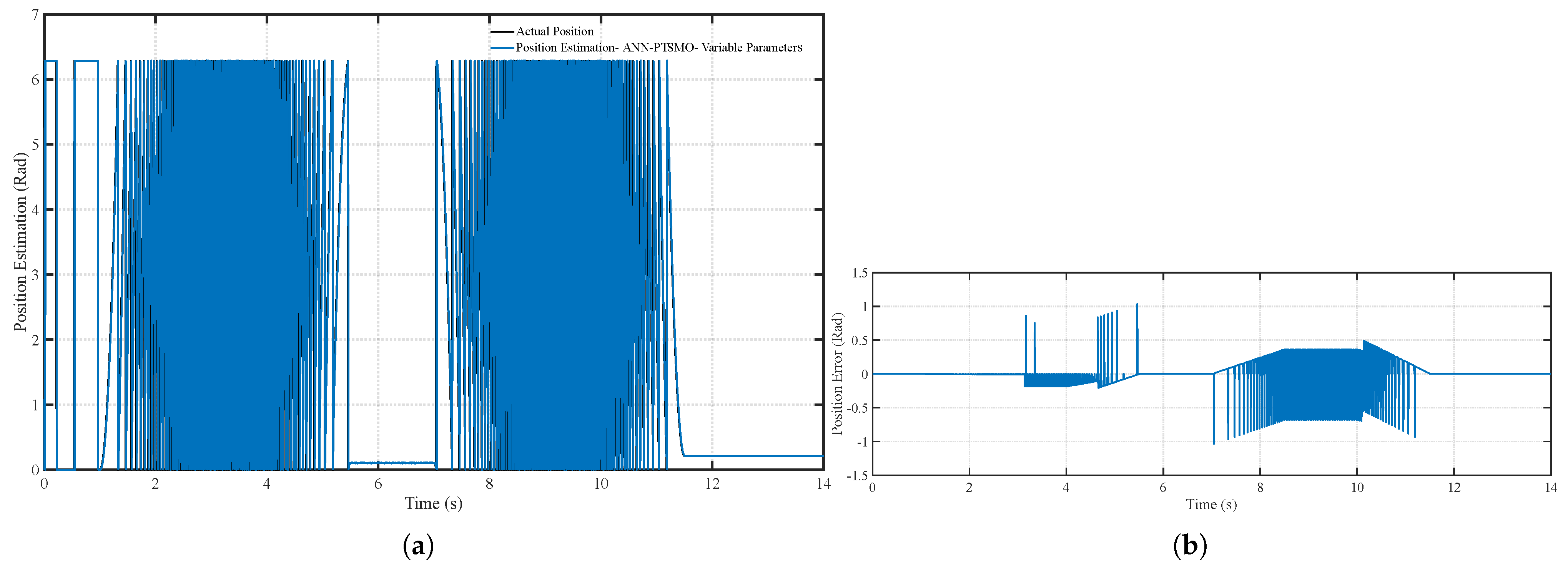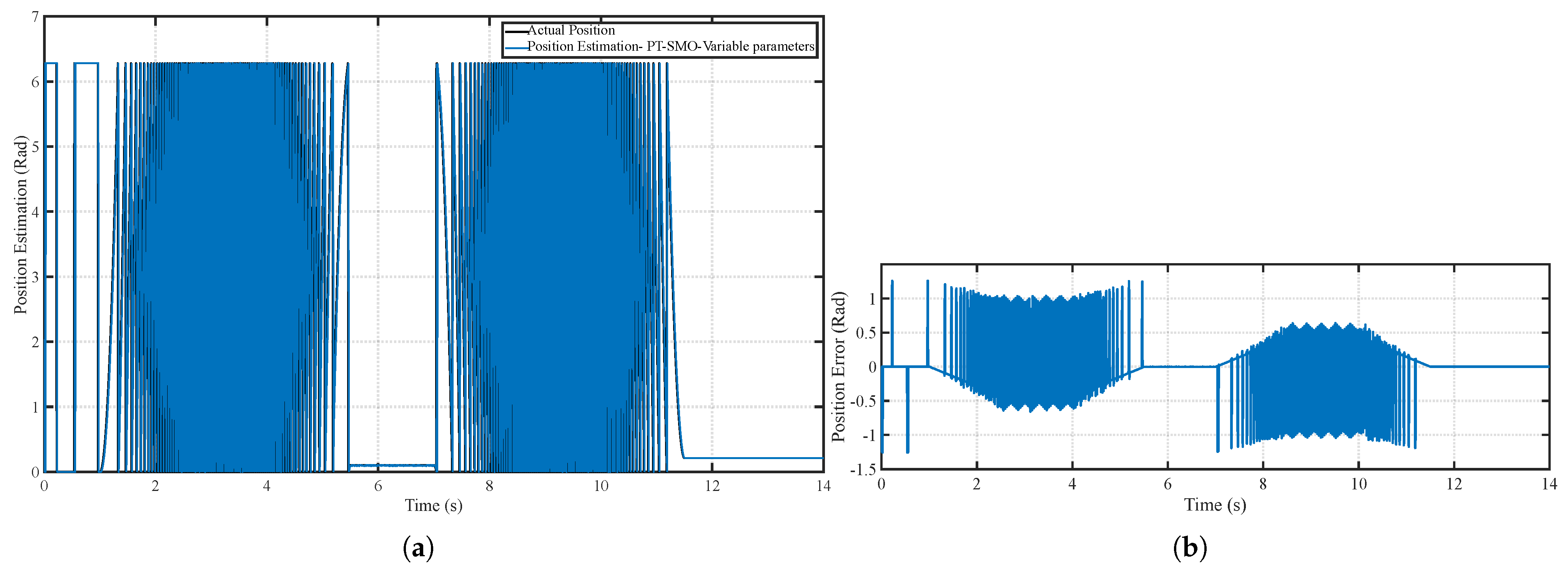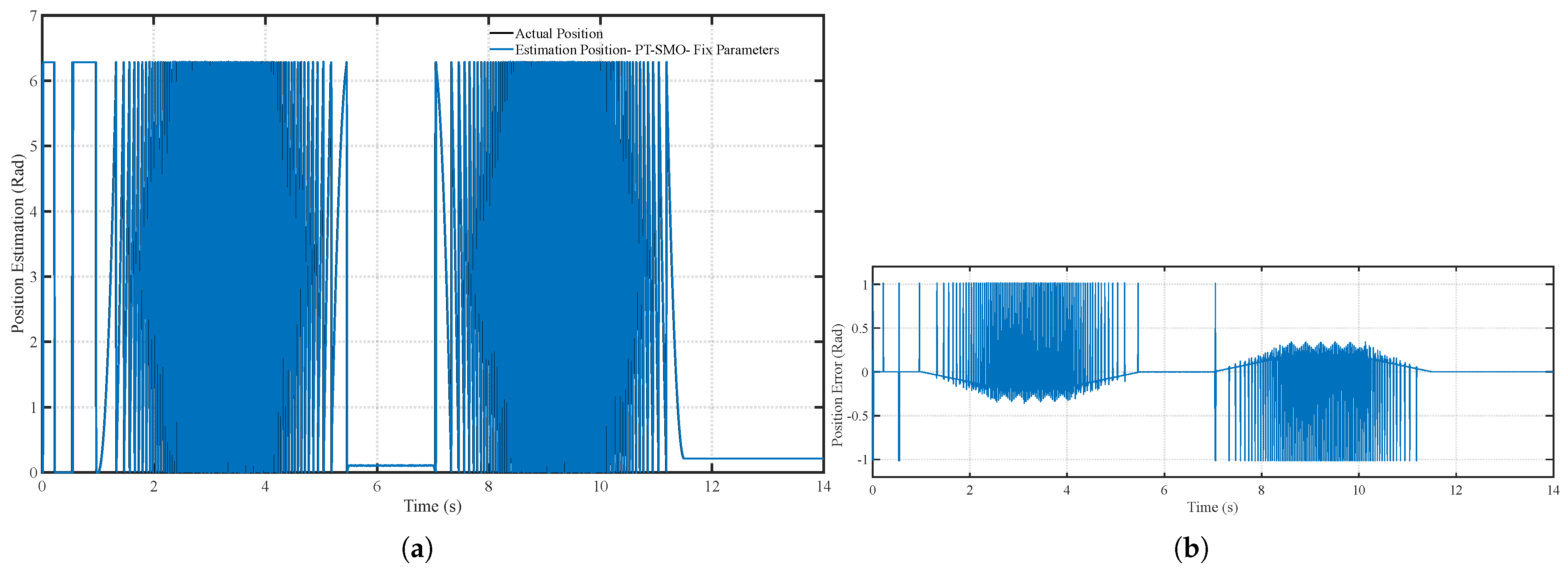 Figure 13. (a) Position tracking performance of the PT-SMO under fixed parameters and (b) Position tracking error of the PT-SMO under fixed parameters.