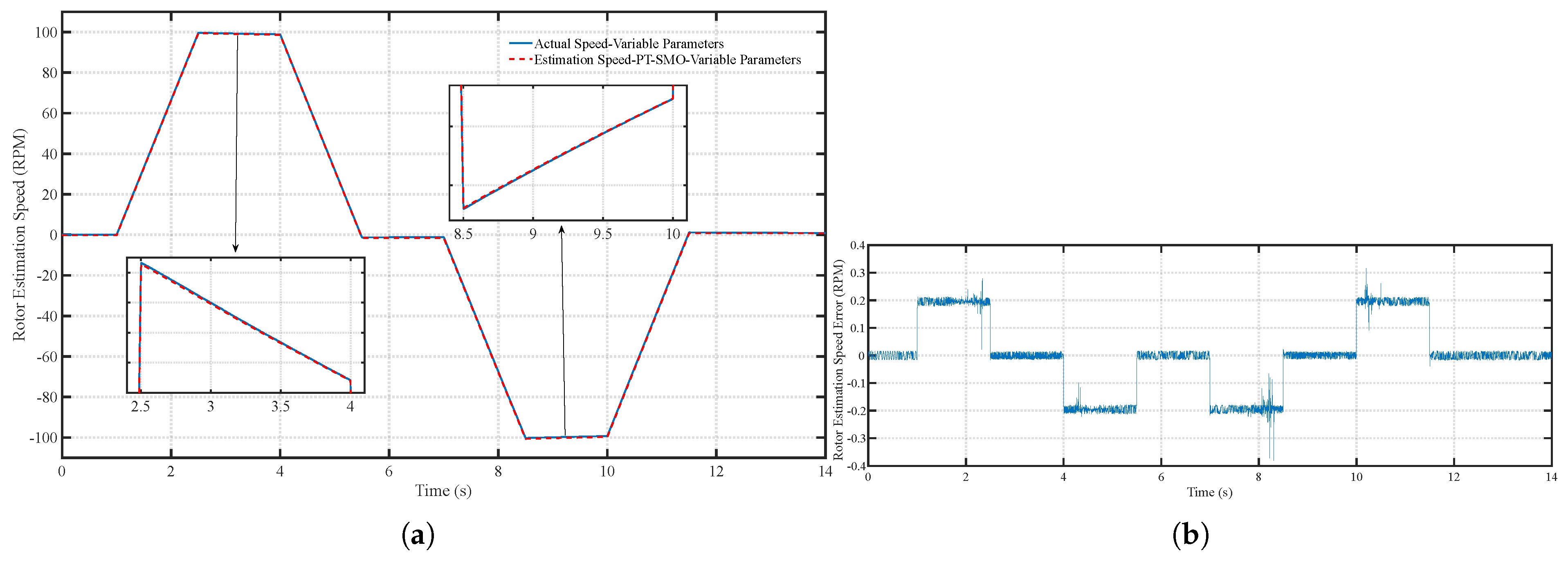 Figure 14. (a) Speed tracking performance of the PT-SMO under variable parameters and (b) Speed tracking error of the PT-SMO under variable parameters.