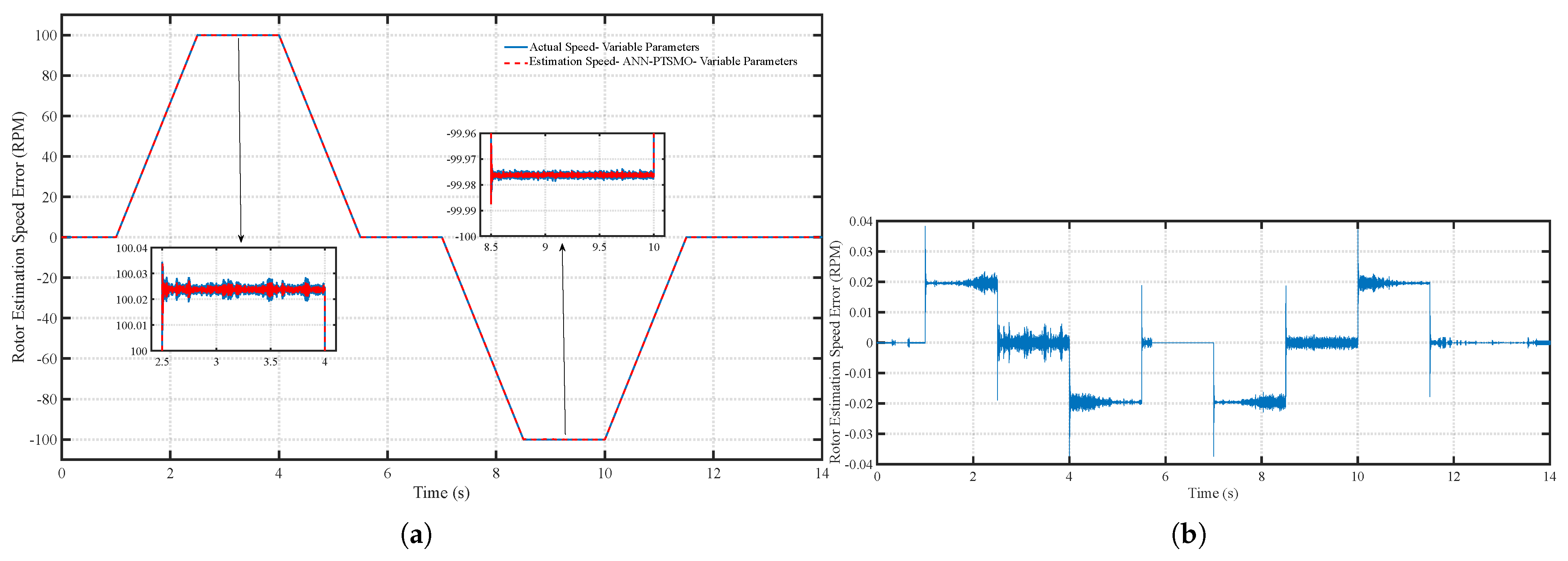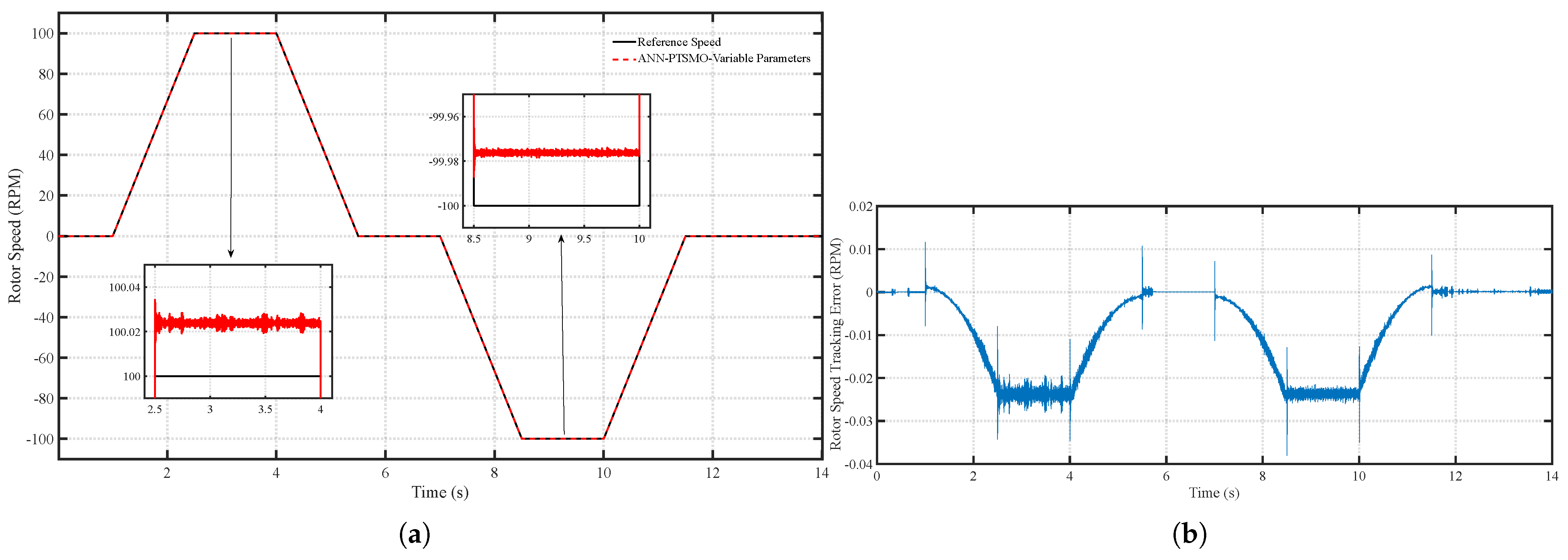 Figure 17. (a) Speed tracking performance of the ANN-PTSMO under variable parameters and (b) Speed tracking error of the ANN-PTSMO under variable parameters.