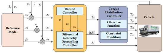 8] proposed a hierarchical control strategy. The upper-layer controller employed sliding mode control to coordinate the rear-wheel steering angle and direct yaw moment, while the lower-layer controller optimized torque distribution based on the tire load rate to enhance vehicle stability. Chen et al. [